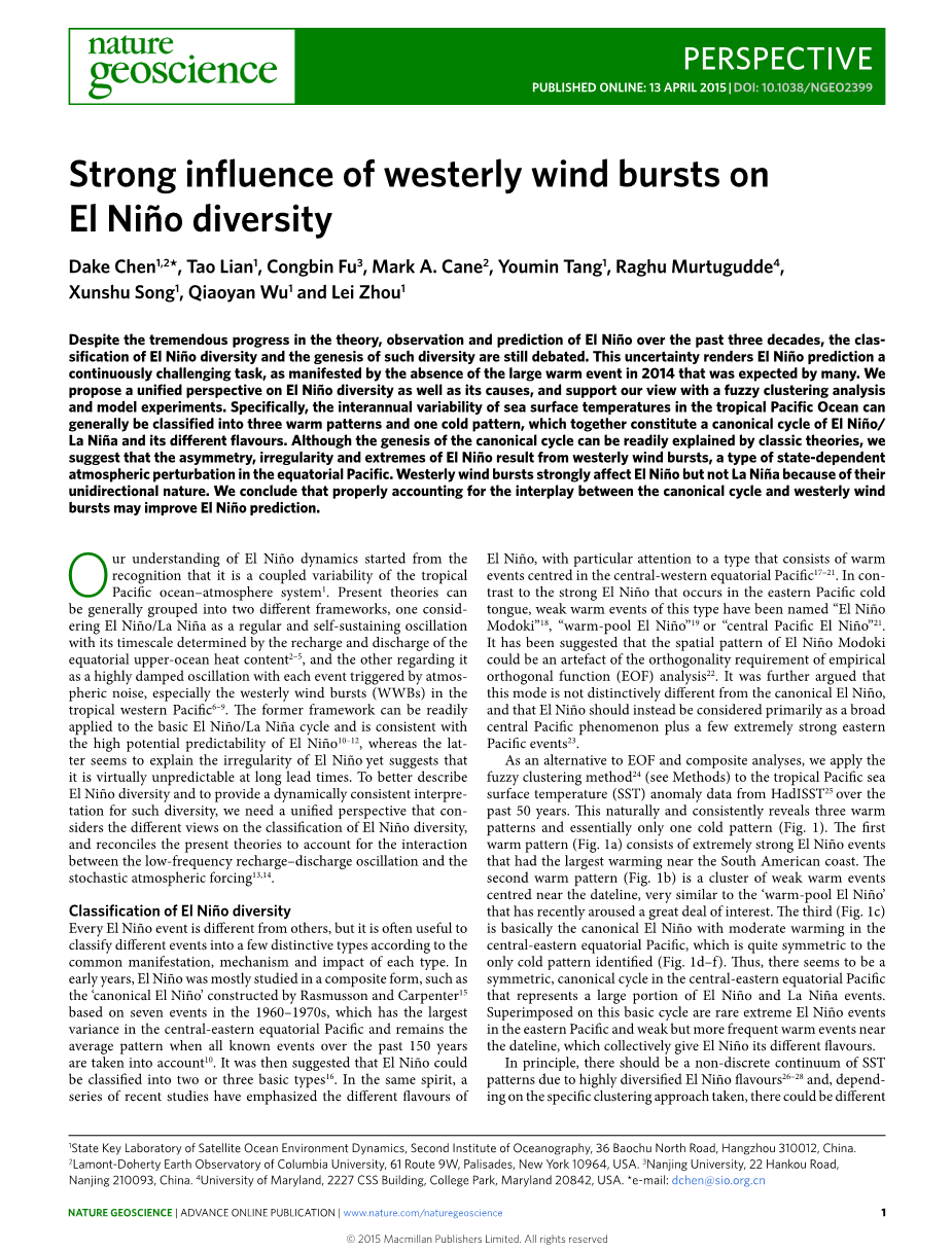尽管在过去三十年间对于El Nino的理论、观测和预测上面有巨大的进步,但是El Nino多样性的分类以及这种多样性的起源仍然是被人们所辩论的。这种不确定性使El Nino的预测成为一个持续性的具有挑战的任务,显现在2014年被许多人所预料的大范围变暖事件的并未发生上面。我们打算建立一个对于El Nino多样性以及其成因的统一的思考方法并且用模糊的分析和模型实验来为我们的观点提供依据。具体地热带太平洋海表温度年际间的变化能被分为三个暖模式和一个冷模式,这四个模式一起构成El Nino/La Nina及其不同特色的典型循环。虽然典型循环的起源能容易地用经典理论来解释,但我们提议El Nino的不对称,不规则及极端性是起因于西风爆发,一种在太平洋赤道处的大气扰动的类型。但是由于它们单向性的性质西风爆发强烈地影响El Nino但是并不影响La Nina。我们的结论是适当的传统循环和西风爆发之间的相互影响可能会提高El Nino的预测。