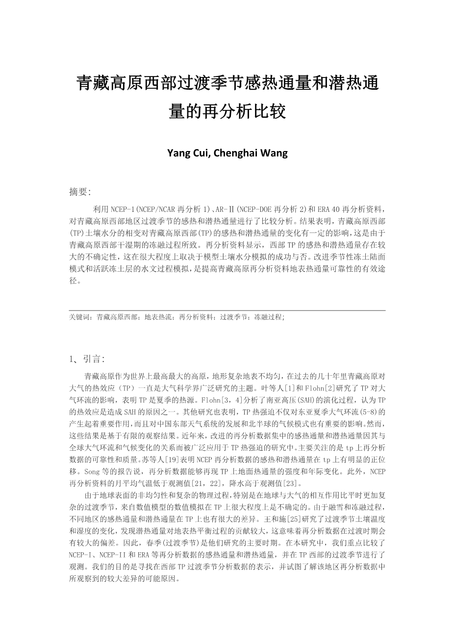 青藏高原西部过渡季节感热通量和潜热通量的再分析比较外文翻译资料