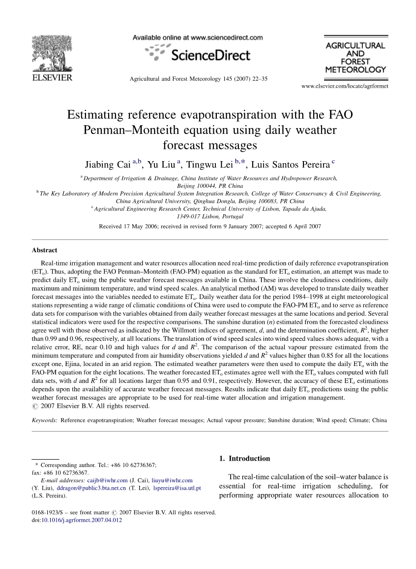 摘要 实时灌溉管理和水资源分配需要预测实时每日参考蒸散量(ETo)。因此,本研究采用FAO Penman-Monteith(FAO-PM)方程作为ETo 的估算标准,并尝试利用中国现有公共天气预报信息预测每日ETo 。这些预报信息包括云量条件,每日最高和最低温度以及风速量级。为了将预报信息转换为估算ETo所需的变量,一种分析方法(AM)得以被开发出来。本研究选取能够代表中国广大范围气候状况的八个气象站1984至1998年期间的每日天气数据计算FAO-PM ETo,并将这些数据作为参考数据集,用以与根据天气预报信息获得的同一地区和时期的变量作对比。这几个统计指标被用于各自的比较。在所有地区,通过预测云量状况估算得到的日照时数(n)与由Willmott协议指数d和确定系数R2高于0.99和0.96显示出的观测情况一致。将风速量级转换为风速值,具有约为0.10的相对误差RE和较大的d与R2值。从利用最低温 度估算得到的实际蒸汽压和利用空气湿度观测值得到的实际蒸汽压的比较中可以得出,除了位于干旱地区的额济纳之外,所有位置的d和R2 值都高于0.85。然后利用估计的天气参数和FAO-PM方程计算八个地区的每日ETo。使用预测天气变量估算的ETo值与使用完整数据集计算的ETo值一致,所有地区的d和R2都大于0.95和0.91。然而,这些估算的ETo的准确性取决于准确的天气预报消息的可用性。结果表明,使用公共天气预报信息预测的每日ETo适用于实时水资源分配和灌溉管理。 关键词:参考蒸散量;天气预报信息;实际蒸汽压;日照时数;风速;气候;中国