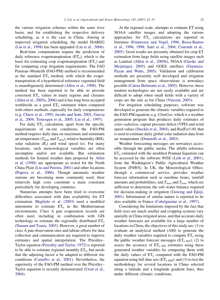 1.简介 土壤-水平衡的实时计算对于实时灌溉调度至关重要,土壤-水平衡的实时计算是为了在同一流域内针对不同的灌溉方案进行适当的水资源分配和建立各自的输送调度安排,这正是我国的现状。同时,为了改进灌溉调度,ISAREG模型(Liu 等,1998)也经过了升级与革新(Liu 等,2006)。 实时计算需要预测每日参考蒸散量(ETo),这是估算作物蒸散量(ETc)和计算作物灌溉需求的基础。FAO Penman-Monteith(FAO-PM)方法被建议作为计算ETo的标准方法,利用该方法可以明确假设参考植被区域的蒸散量(Allen 等,1998)。据称该方法能够在许多地区和气候条件下提供连续一致的 ETo 值(Allen 等,2005a,2006),并且与其他方法相比,特别是对于日常计算来说,它已经在世界范围内作为一种优秀的ETo估算方法获得了广泛认可(例如Chiew 等,1995;Jacobs和Satti,2001; Garcia 等,2004;Temesgen 等,2005;Liu 等,1997)。 对于每日ETo计算,除了现场条件的具体要求外,FAO-PM方法需要每日最高气温和最低气温(Tmax和Tmin),相对湿度(RH),太阳辐射(Rs)和风速(u)。对许多地区来说,这些气象变量通常是不完整的、不可用的。但是Allen 等 (1998)提出的有限天气数据的估算方法适用于华北平原(Liu 和 Pereira,2001)和其他地方(Popova 等,2006)的测试。虽然自动气象站的使用越来越普遍,但对于发展中国家来说,其相对较高的成本是制约发展中国家使用自动气象站的主要原因。 研究人员已为克服蒸散量估算方面与数据可用性相关的难题做出了许多尝试。Magliulo 等(2003)使用改进的气压计估算地中海环境中的ETo。研究中通常使用的是A级蒸发皿蒸发量记录,包括与GIS技术相结合以估算区域分布的ETo(Naoum和Tsanis,2003)。然而,这需要大量的A级蒸发皿观测站点和收集数据的劳动力以及通信以改进估算值和空间插值。据称Priestley-Taylor方程(Priestly和Taylor,1972)能够估算区域月度ETo,但需要调整因子alpha;适应不同的站点条件(Castellvi 等,2001)。但是,FAO-PM方法优于Priestley-Taylor方程(Utset 等,2004)最近又得以证明。 在区域尺度上,文献中使用了NOAA卫星图像并采用了各种ETo计算方法以尝试估算蒸散量值(Fennessey和Vogel,1996;Brasa-Ramos 等,1996,1998;Satti 等,2004;Courault 等,2005)。目前使用例如L和sat(Allen等,2005b),NOAA(Gieske和Meijninger,2005)和GOES卫星(GaratuzaPayan和Watts,2005)等卫星图像从大尺度上获取较好的作物蒸散量估算结果。验证和校准方法目前已得到很好的发展,并且通过空间观测进行灌溉管理现在已经成为可能(Calera Belmonte 等,2005)。然而,这些现代技术并不容易获得,并且当中国的区域都是有多种作物的小型区域时这些技术很难得以采用(Vincent,2003)。 为了灌溉调度的目的,用以生成FAO-PM方程所需气候变量的软件得以开发,例如ClimGen,这是一个天气生成程序,可以生成每日太阳辐射,蒸汽压差(VPD)和风速估算值(Stockle等,2004),以及RadEst3.00,可以用于从气温中估算每日全球太阳辐射数据(Donatelli 等,2003)。 公众现在可以通过公共媒体访问天气预报消息。用改进的Penman方程估算的苜蓿参考Eto值可以通过华盛顿公共农业气象系统(PAWS)的软件WISE(Leib 等,2001)访问。在英国,气象办公室通过商业服务提供天气预报信息,如日照时数,降雨量和降雨概率,以及Tmax和Tmin,这些数据已经足以确定灌溉中制定决策所需的土壤-水平衡(Gowing和Ejieji,2001)。据报道,法国也有类似性质的信息(Cabelguenne 等,1997)。 考虑到中国灌溉地区的现实情况带来的限制,即田间面积小得多和种植系统在空间上有所差异,并且中国大量地区可以获得准确的每日天气预报,所以本研究的目标是:(1)使用公共天气预报信息(ETOWF)评估分析方法(AM)以生成计算ETo所需的每日天气变量;(2)通过将这些生成的天气变量与使用完整数据集(ETOPM)和FAO-PM方程计算出的ETO的每日数值进行比较,来评估ETOWF 估算值的准确性;(3)在不同的气候条件下,测试在选中区域使用的方法,这些地区是沿纬度和经度梯度线选出的。 2. 材料与方法 2.1.FAO Penman-Monteith方程和AM方法 被推荐作为每日ETo(mm day-1)估算方法的FAO-PM方程(Allen 等,1998)可写为: