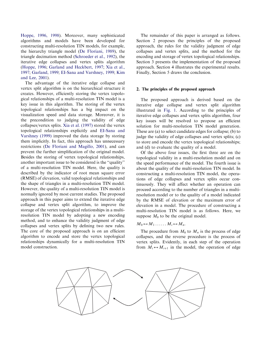 不规则三角网(TIN)是一种通用的表面模型,因其具有简单的数据结构和可以被常用图形硬件渲染的特性而广泛的应用于地理信息系统,计算机图形的虚拟现实技术中。为了表达模型的细节,一种高分辨率的TIN模型(具有密集三角网络)应用颇广。虽然如此,高分辨率的TIN模型的表达任然需要处理大量的数据,并且在计算时需要耗费大量的时间。另一方面,尽管低分辨率的模型表达可以减少计算的数据量,但是模型的细节将会丢失。因此,可以根据要求选择不同层次下不同模型细节的可变分辨率的TIN模型来解决这个问题。多分辨率TIN模型是集3D压缩,地形可视化,多分辨率分析和渐进传输等方面的一个重要研究领域。它已经被许多学者研究过(DeFloriani,1989; Mallat,1989; Eck et al,。1995; DeFloriani等,1996,2000; Lindstrom等,1996; 霍普,1996年,1998年)。许多复杂的算法和模型都被开发出来用来构建多分辨率TIN模型。例如,层次三角法,三角抽取法,迭代边缘崩溃和顶点算法。