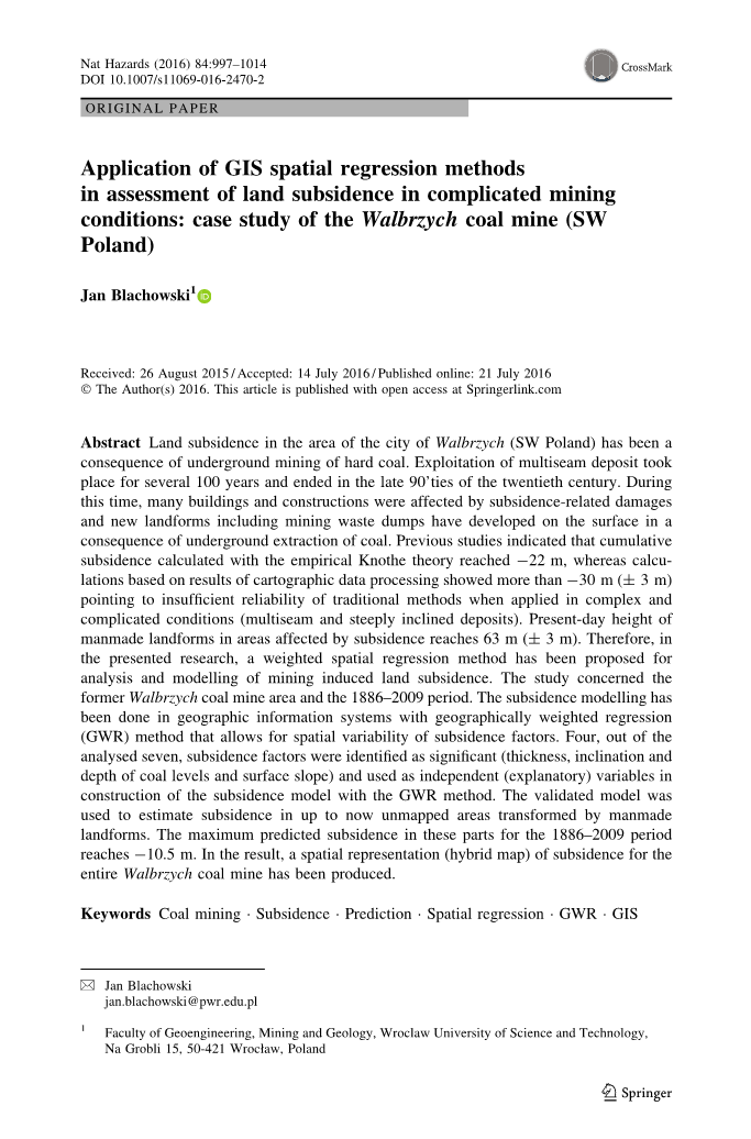 这个简明的评论表明,开采沉陷监测和建模以及与地面和基础设施相关的危害是一个当前科学和实际问题。本文提出了一种基于GIS的加权空间回归方法来研究SW波兰前Walbrzych煤矿区的采矿相关地面沉降问题。在之前关于这方面的研究中,已经发现传统上使用的基于经验假设的开采沉陷建模方法,如Knothe理论(Knothe理论 1984)可能提供的结果对于众多薄而陡峭的煤层煤层并不总是可靠的(Blachowski和Milczarek 2014).
