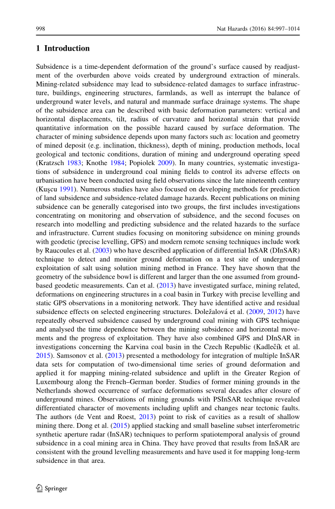 沉降是由地下矿物提取产生的空洞上方覆盖层重新调整引起的地表时间变形。与采矿有关的沉降可能会导致与地表基础设施,建筑物,工程结构,农田的沉降相关的损害,并且会中断地下水位的平衡以及自然和人造的地面排水系统。沉降区的形状可以用基本的变形参数来描述:垂直和水平位移,倾斜,曲率半径和水平应变,提供关于由表面变形引起的可能危害的定量信息。采矿沉陷的特征取决于许多因素,如:开采矿床的位置和几何形状(如倾斜度,厚度),采矿深度,生产方法,当地地质和构造条件,采矿时间和地下作业速度(Kratzsch 1983; Knothe 1984; Popiolek 2009)。在许多国家,为了控制其对城市化的不利影响,系统地研究了地下煤矿开采领域的沉降问题,自19世纪末以来一直采用实地观察 1991)。许多研究也集中在开发预测地面沉降和沉降相关损伤危险的方法。最近关于采矿沉陷的出版物一般可分为两类,第一类包括重点关注监测和观测沉降的调查,第二类重点研究建模和预测沉陷以及对地面和基础设施造成的相关危害。目前关于采用大地测量(精确调平,GPS)和现代遥感技术监测采矿场地沉降的研究工作包括Raucoules等人的工作。(2003)描述了应用差分InSAR(DInSAR)技术在法国采用溶液采矿法在地下开采盐场的试验场地上检测和监测地面变形。他们已经表明,沉降盆的几何形状不同于并且大于从基于地面的大地测量中假定的几何形状。Can等人。(2013)已经在土耳其的一个煤矿盆地中调查了与地表,采矿有关的变形,并在监测网络中进行了精确的水准测量和静态GPS观测。他们已经确定了选定工程结构的主动和剩余沉降效应。Dolezalova#39;等人。(2009, 2012)利用GPS技术反复观测地下开采引起的地表沉陷,分析了开采沉陷与水平运动的时间依赖性和开采进度。他们还将GPS和DInSAR结合起来用于调查捷克Karvina煤盆地(Kadlecıket al。2015)。Samsonov等人(2013)提出了一种用于整合多个InSAR数据集的方法,用于计算地面变形的二维时间序列,并将其应用于法国和德国边界沿线卢森堡大区的与采矿有关的沉降和隆升绘图。对荷兰前采矿场的研究表明,在地下矿山关闭数十年后,地表变形发生。采用PSInSAR技术的采矿场观测揭示了运动的差异性,包括构造断层附近的抬升和变化。作者(de Vent和Roest,2013)指出由于浅层采矿造成的龋洞风险。董等人。(2015)应用堆积和小基线干涉合成孔径雷达(InSAR)技术对中国煤矿区地面沉降进行时空分析。他们已经证明,InSAR的结果与地面平整测量结果一致,并已用于绘制该地区的长期沉降。