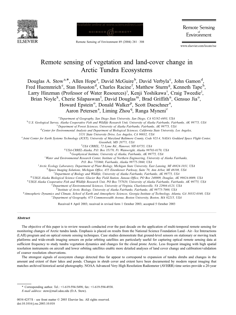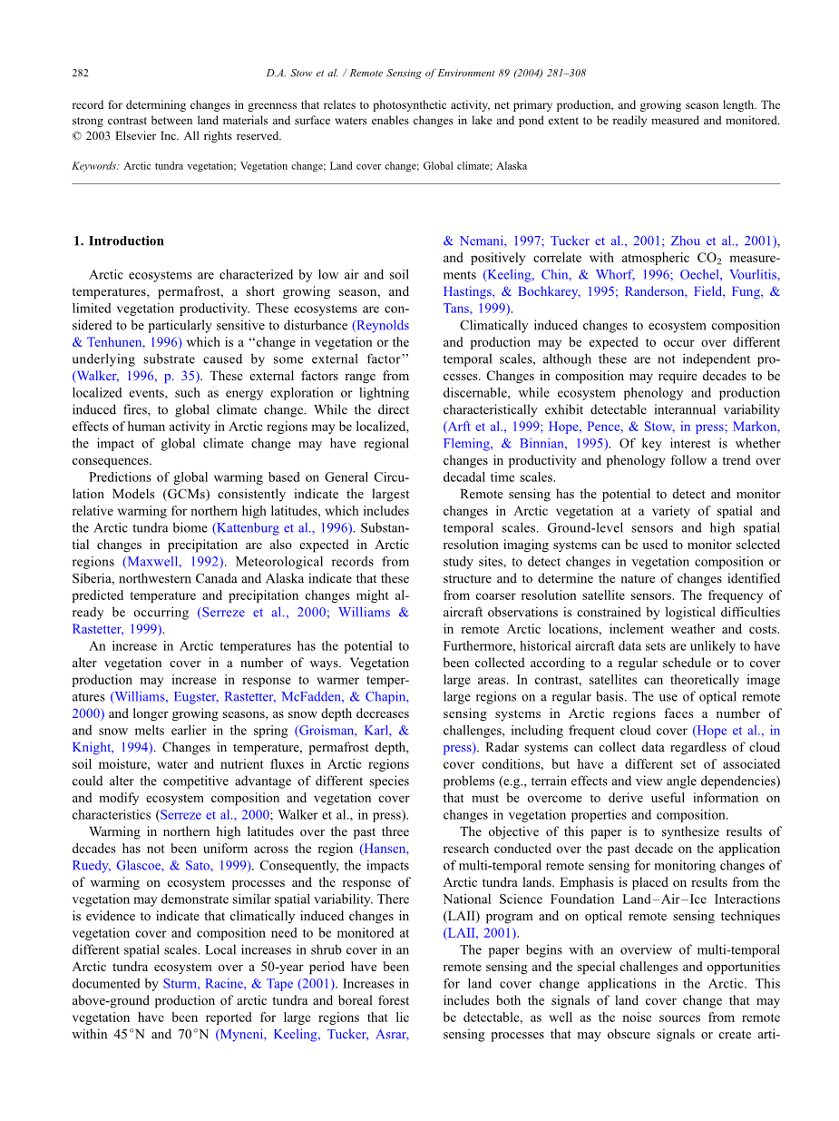 本文的目的是综合利用过去十年对多时间遥感监测北极苔原地区变化的研究成果。重点研究了国家科学基金会陆地-空气-冰相互作用(LAII)项目和光学遥感技术(LAII, 2001)的结果。