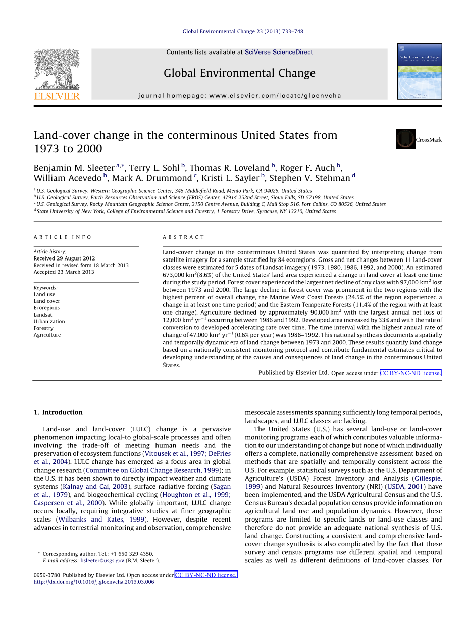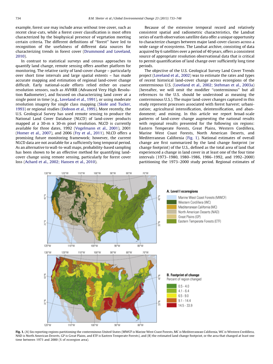 美国地质调查局的土地覆盖趋势项目的目标是估计最近美国的生态区域s的历史土地覆盖变化的速率和类型。本研究中所述的主要土地覆盖变化是与森林收获有关的过程;城市化;农业集约化、集约化、退耕;和采矿业。在本文中,我们报告大规模覆盖模式变化增加国家结果与区域的结果提出了以下六个区域:东部温带森林,平原,西部山脉,海洋西海岸森林,北美的沙漠和地中海加州(图1)。国家整体变化的估计首先是由土地变化足迹(或改变足迹)来总结在1973-1980年、1980-1986年、1986-1992年和1992-2000年的四个时间间隔中,至少有一次土地覆盖发生变化的土地总面积,即1973-2000年的研究期间。
