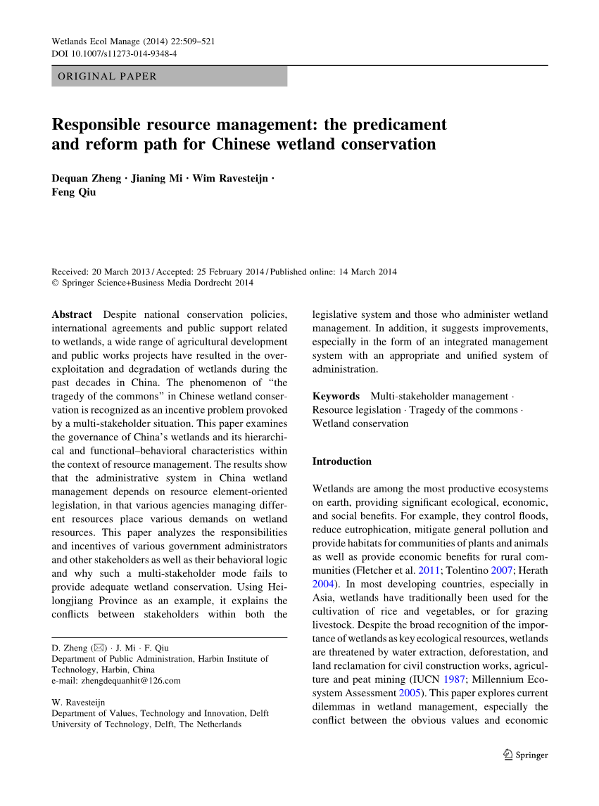 关键词 多方利益相关者管理;资源立法;公地悲剧;湿地保护