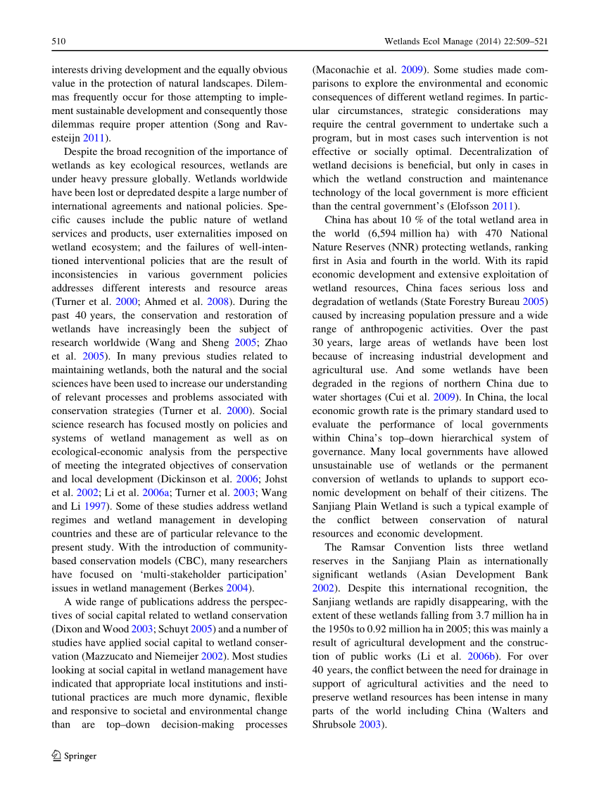 大量的出版物涉及与湿地保护有关的社会资本的观点和一些研究已经将社会资本应用于湿地保护。大多数研究在湿地管理中关注社会资本的研究表明,与自上而下的决策过程相比,恰当的地方机构和机构实践更加动态,灵活并且对社会和环境变化作出反应。一些研究比较了不同湿地体系对环境和经济后果的影响。在特殊情况下,战略考虑可能要求中央政府采取这样的方案,但在大多数情况下,这种干预措施不是有效的或社会最优的。分散湿地决策是有益的,但只有当地方政府的湿地建设和维护技术比中央政府更有效时。