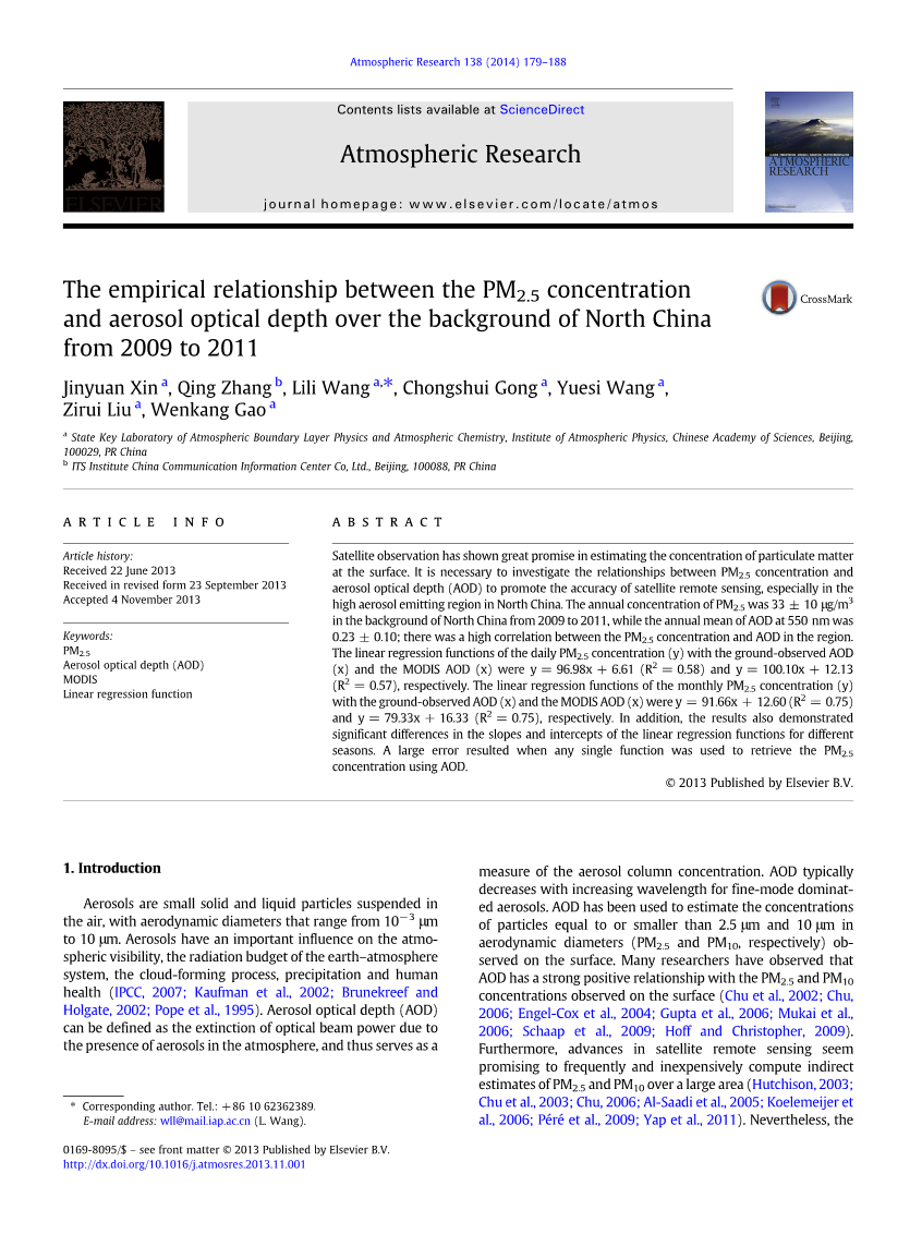 卫星观测在估计地表颗粒物浓度方面表现出很好的前景。因此有必要研究PM2.5浓度与气溶胶光学厚度(AOD)之间的关系,以提高卫星遥感的精度,特别是在高气溶胶排放的华北地区。2009-2011年华北地区PM2.5年均浓度为33plusmn;10mu;g/m3,而AOD在550 nm处的年平均值为0.23plusmn;0.10,该地区PM2.5浓度与AOD之间存在高度相关性。日均PM2.5浓度(y)与地面观测到的AOD(x)和MODIS AOD(x)的线性回归函数分别为y = 96.98x 6.61(Rsup2; = 0.58)和y = 100.10x 12.13(Rsup2; = 0.57),每月PM2.5浓度(y)与地面观测到的AOD(x)和MODIS AOD(x)的线性回归函数分别为y = 91.66x 12.60(Rsup2; = 0.75)和y = 79.33x 16.33(Rsup2; = 0.75)。此外,结果还显示了不同季节的线性回归函数的斜率和截距的显著差异。仅仅使用任何单一功能来利用AOD检索PM2.5浓度时会产生较大的误差。