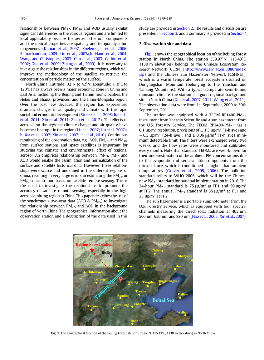 华北地区(北纬32°至42°;东经110°至120°E)包括北京和天津的直辖市,河北和山西两省以及内蒙古地区,一直是中国和东亚的主要经济区。过去几十年来,随着社会和经济的快速发展,该地区的空气质量和气候发生了巨大的变化(Streets et al., 2008; Itahashi et al., 2011; Xin et al., 2011; Zhao et al., 2012) 气溶胶对区域气候变化和空气质量的影响已成为该地区的热门话题(Li et al., 2007; Liu et al., 2007a,b; Xia et al., 2007; Xin et al., 2007; Lu et al., 2010)。从地面监测站和空间卫星连续监测观测数据例如AOD,PM2.5和PM10,对研究区域气溶胶的气候和环境影响很重要。PM2.5,PM10和AOD之间的经验关系将使得地表和卫星历史数据的同化和归一化成为可能。但是,这些关系在中国不同地区很少见,并且具有不确定性,因此基于卫星遥感估算PM2.5或PM10浓度的误差非常大。因此需要调查这些关系以促进卫星遥感的准确性,特别是在中国的高气溶胶排放地区。本文描述了利用连续的两年的数据(AOD和PM2.5)来研究华北地区PM2.5和AOD之间的关系。第2节章提供了关于观测站的地理信息和本研究中使用的数据的描述。第3章中介绍了结果和讨论,第4章是本文的总结。