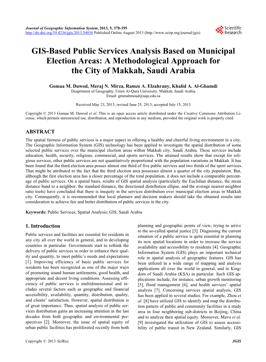 公共服务和设施对居民来说至关重要一般世界上的任何城市,以及发展中的城市特别是国家。 各国政府开始重新思考提供公共服务以提高他们的素质 数量和质量,以满足公众的需求和期望。提高基本公共服务效率居民被认为是主要途径之一促进健康的人类住区,健康和健康适当和体面的生活条件。评估有效公共服务的效率是多层面的,包括地理和财务等几个因素可用性,可用性,数量,分布,质量,和客户的满意度。但是,空间分布是非常重要。因此,公共服务的空间分析,恶意分发在最后得到越来越多的关注从地理和环境的角度来看。而且,空间公平的问题城市公共设施最近从两地扩大规划和地理观点,试图到达到所谓的空间正义。诊断电流公共服务的情况在规划中非常重要其新的空间位置,以增加服务可用性和可访问性。地理信息系统(GIS)起着重要的技术作用在地理特征的空间分析中的作用。GIS有被广泛用于绘图和分析一般在世界各地的应用程序,以及在尤其是沙特阿拉伯的沙特阿拉伯(KSA)。这种GIS 例如包括城市发展监测,洪水管理和卫生服务的空间分析。关于服务空间分析,GIS已经在几项研究中应用。例如,周等利用地理信息系统来识别和映射分布式数据库,研究中的公共和社区设施的模式在中国北京四个相邻的街区并分析他们的空间公平。此外,Mavo等人调查了地理信息系统的利用情况,新西兰公共交通的能力。同样,GIS被用于开发社交网站适用性模型在亚特兰大市服务。另外,GIS已经用于识别公共跨国公司的时空差距,在比利时的移植服务。在沙特阿拉伯,政府服务主要由政府提供重要关注圣城麦加。 1990年至2010年期间,麦加总住宅区从99.23增加到158.58平方千米,年率4.8%。另外,每年一次沙特阿拉伯的人口增长率接近2.9%。 都增长率强调需要新的公共服务根据数量和空间分布来看, 这个论文利用地理信息系统绘制和分析地理信息系统基于市政的现有公共服务在麦加的选举地区。