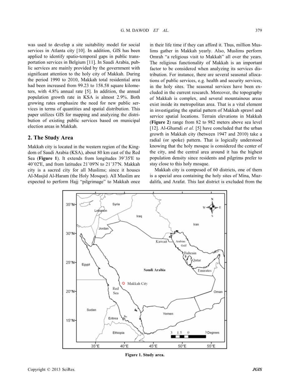 麦加城市位于国王的西部地区,沙特阿拉伯(沙特阿拉伯)在沙漠以东约80公里处海(图1)。它从经度39˚35#39;E延伸到40˚02#39;E,纬度21˚09#39;N到21˚37#39;N。麦加城市是所有穆斯林的神圣城市;因为它的房子Al-Masjid Al-Haram(神圣清真寺)。所有穆斯林都是预计会向麦加执行一次朝觐“朝觐”如果他们能负担得起的话,在他们的生活中。因此,限制每年聚集在麦加。此外,穆斯林表演多年来,Omrah是“对麦加的宗教访问”。麦加的宗教功能是重要的分析其服务时要考虑的因素。例如,有几个季节性分配公共服务,例如健康和安全服务,在圣地。这些季节性服务已经过去了,包括在当前的研究中。而且,地形麦加是复杂的,还有几个山区存在于其大都市区内。这是一个至关重要的因素在调查麦加蔓延的空间格局服务空间位置。麦加的地形海拔(图2)海拔82至982米。 Al-Ghamdi等人得出的结论是城市麦加市(1947至2010年间)的增长率达到一个径向(或辐条)图案。这是逻辑理解的知道圣洁清真寺被认为是中心这座城市和它周围的中心地区是最高的自居民和朝圣者更喜欢的人口密度靠近这座神圣的清真寺。麦加市由60个地区组成,其中之一是一个特殊的地区,包含达利法和阿拉法特。这个最后的地区不包括在内目前的研究,因为它的公共服务是季节性的自然和只在朝圣季节运作。麦加有七个市级选区,第七区包含西部乡村,侧面城市的城市范围。 因此,只有六个城市内的城市市区选举地区得到了实施在本研究中考虑(图3)。表1和图4显示了人口的相对分布麦加市的市政选举地区。 可以被看见第三选区人均收入最高,百分比,它包含了该城市的四分之一以上总人口。 第一个选举区域,城市交通方面,排名第二。 第五和第六市政选举地区的人口最少,因为它们是新近城市化的地区。