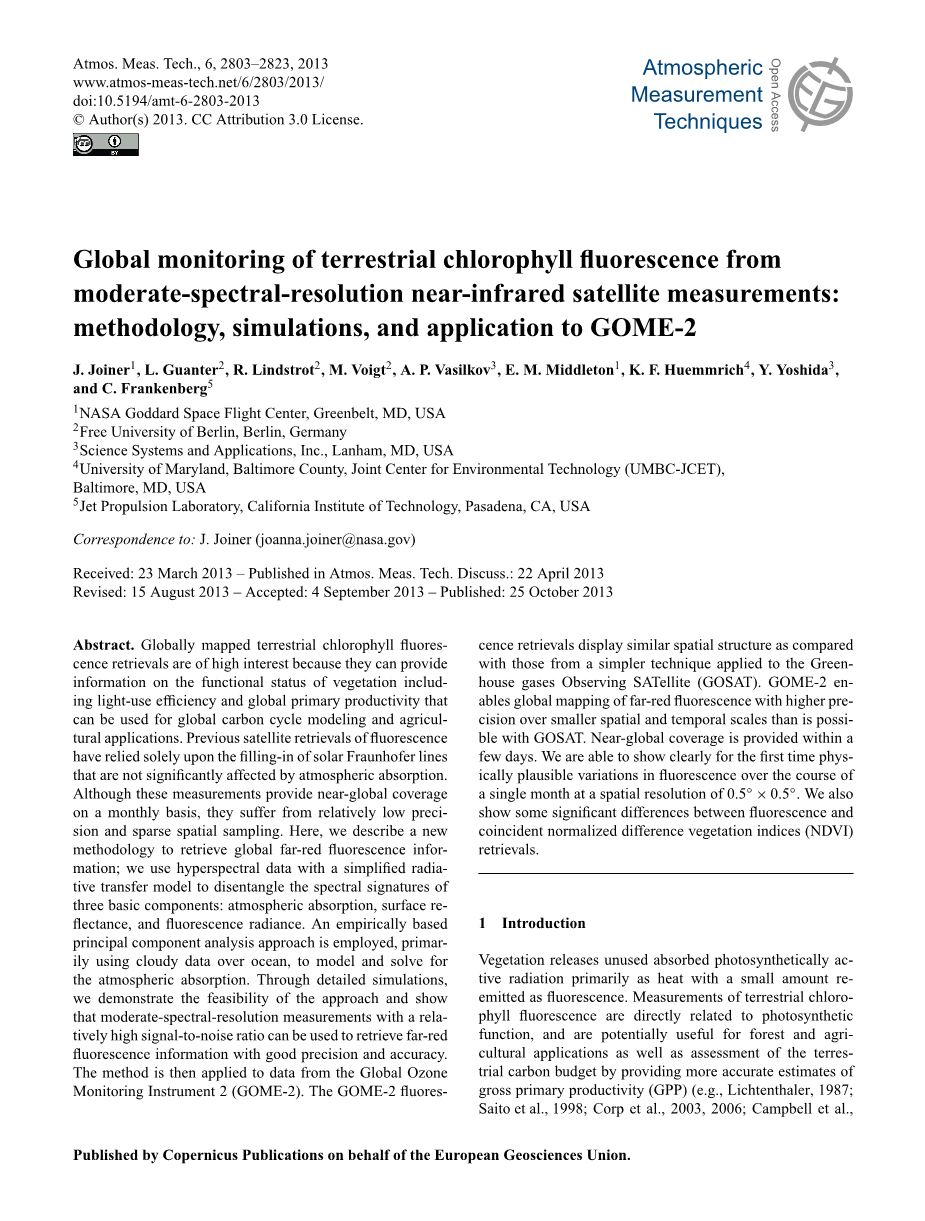 J. Joiner1, L. Guanter, R. Lindstrot, M. Voigt, A. P. Vasilkov, E. M. Middleton1, K. F. Huemmrich, Y. Yoshida,and C. Frankenberg