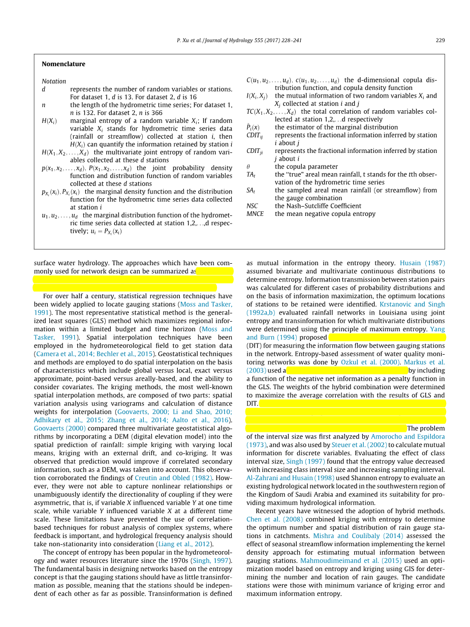 假定二元和多元连续分布来确定熵。根据不同的概率分布情况计算不同站点之间的信息传输,并根据信息最大化确定待保留站点的最佳位置。Krstanovic和Singh(1992a,b)使用联合熵和转换信息评估了路易斯安那州的降雨网络,其中多元分布是使用最大熵原理确定的。 Yang和Burn(1994)提出了方向信息传递指数(DIT),用于测量网络中测量站之间的信息流。基于熵的水质监测网络评估由Ozkul等人完成。(2000年)。 Markus等(2003)使用GLS和DIT指数的混合组合,通过在GLS中包含负净信息的函数作为惩罚函数。确定杂种组合的权重以最大化与GLS和DIT的结果的平均相关性。他们发现,无论在改变垃圾箱大小时熵值有多大的差异,在收到的信息与发送的信息之间的差异方面,站点的排名在大多数情况下仍然保持不变。间隔大小的问题首先由Amorocho和Espildora(1973)分析,并且也被Steuer等人使用(2002)计算离散变量的信息。 Singh(1997)在评估类间隔大小的影响时发现,熵值随着类间隔尺寸的增加和抽样间隔的增加而减小.Al-Zahrani和Husain(1998)利用香农熵来评估位于西南地区的现有水文网络审查了沙特阿拉伯王国提供最大水文信息的适宜性。