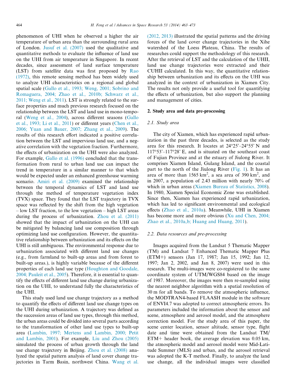 厦门被作为本次的研究对象,它在过去的三十年里经历了快速的城市化进程。它的坐标是24°25′-24°55′N,117°53′-117°28′E。位于福建省东南海岸的九龙江河口。它包括厦门岛、古浪岛和九龙江北部的海岸部分(图一)。它的面积1565多公里,海域面积390公里。在2007年,有243万人口,接近70%的人口在市区(厦门市统计局,2008)。在1980年成立了厦门经济开发区,从那时候开始,厦门的快速城市化导致了严重的环境和生态影响(Zhao et al.,2010)。与此同时,城市热岛效应在厦门变得越来越明显(Xu and Chen, 2004;Zhao et al, 2010a, b; Huang and Huang, 2011)。