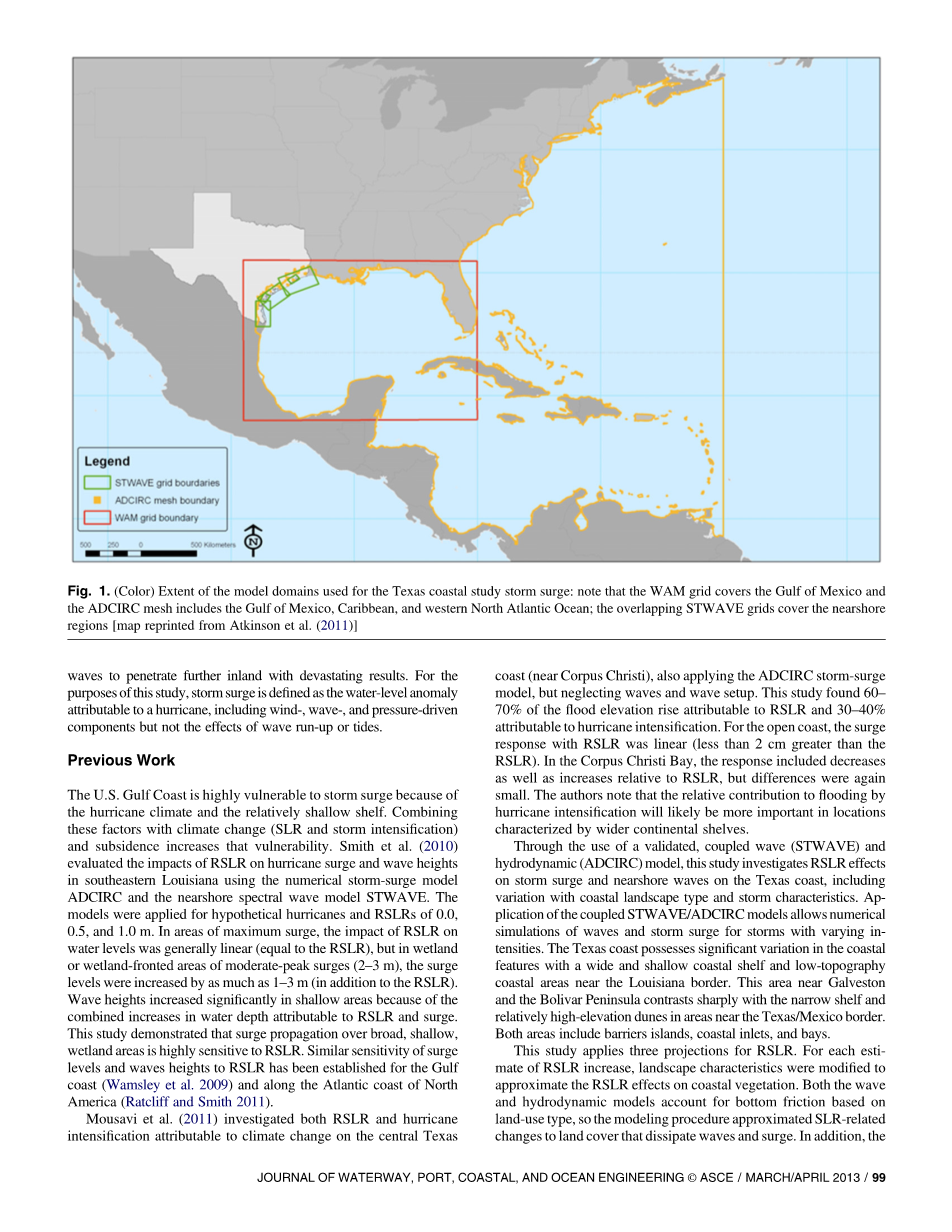 由于美国的飓风气候和相对来说较浅平的海岸,海湾的沿岸非常容易受到风暴潮的危害。再加上气候变化(海平面上升和风暴加剧)和地面沉降,这种危害更加严重。Smith 等(2010)曾使用数值风暴潮模型ADCIRC和近海岸光谱波浪模型STWAVE估算路易斯安那州南部相对海平面上升对飓风波浪和波浪高度的影响。这些模型被应用于假想的0.0、0.5和1.0m飓风及相对海平面上升.在波浪最大的区域,相对海平面高度对水位的影响大致上呈线性相关(与相对海平面上升相同)。但是在有中等峰值波动的湿地和湿地前滩(2-3m),波动程度增加了1-3m(排除了相对海平面上升的影响之后)。由于相对海平面上升和波浪共同造成水深增加,波浪高度在浅滩区域显著增加。本研究显示波浪在平地、浅滩和湿地区域的传播效果对相对海平面上升的高度非常敏感。经证实在海湾沿岸(Wamsley 等, 2009)和北美洲的大西洋海岸波(Ratcliff and Smith 2011)浪等级和波浪高度对RSLR有同样的敏感度。