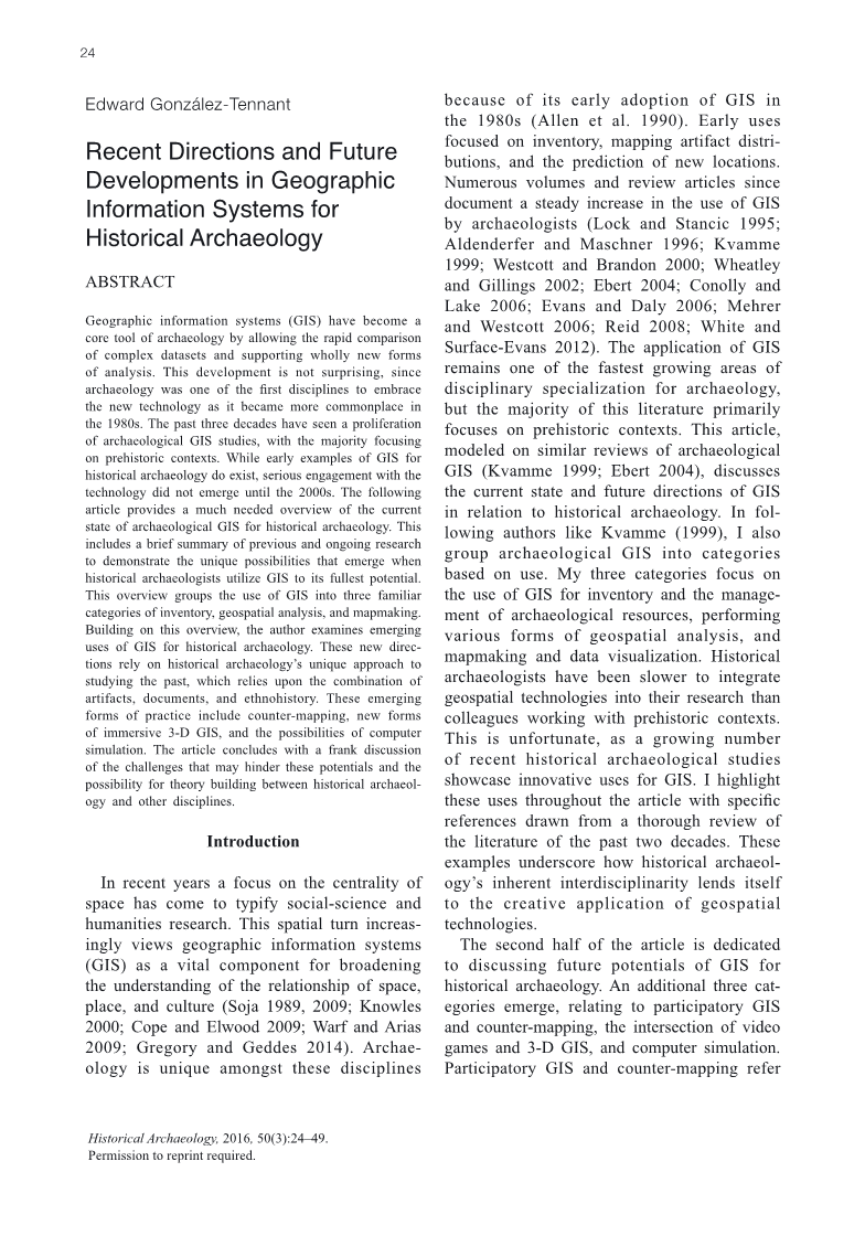 文章的后半部分主要探讨地理信息系统在历史考古中的应用前景。另外还出现了三个类别,涉及参与性地理信息系统和反映射、电子游戏和三维地理信息系统的交叉以及计算机模拟。参与性地理信息系统和反图纸参考以包容性的研究形式为中心的公众关注与研究人员的研究,整齐地交叉最近的趋势在公共考古学。电子游戏和三维地理信息系统的交叉使用户能够以更互动的方式体验过去,同时也以越来越直观的格式提供考古数据。历史考古学家还没有对计算机模拟进行实验,但通过地理信息系统软件获得的数据越来越多,这对分析历史过去具有巨大的潜力。除了扩大历史考古学的实践外,这些未来的用途鼓励解决教学问题,同时支持考古学理论建设的新途径。