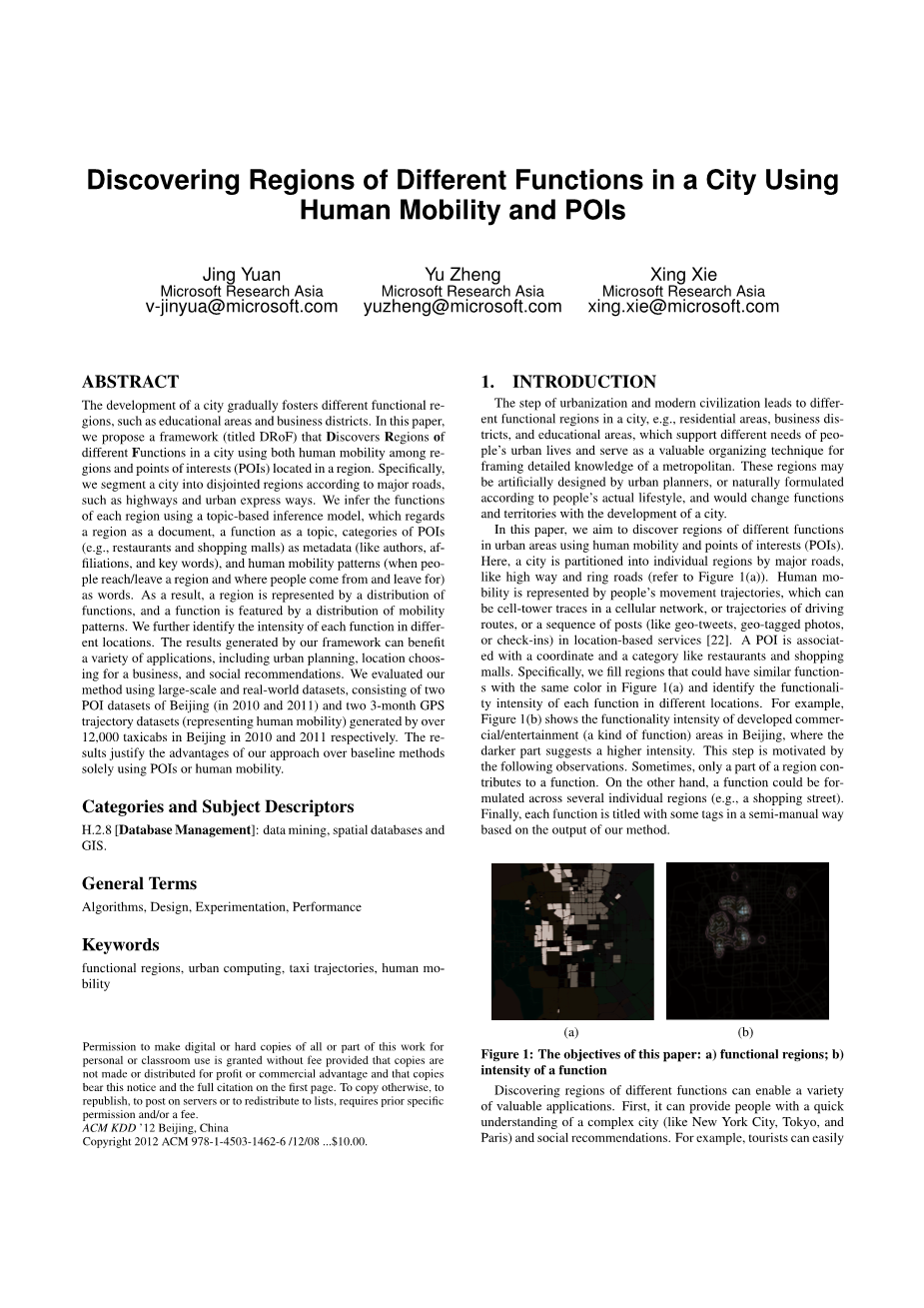 城市化和现代文明的进程导致了城市中不同的功能区,例如住宅区、商业区和教育区,这些功能区支持了人们城市生活的不同需求,并作为一种有价值的组织技术来构建一个大都市的详细知识。这些区域可能是城市规划者人为设计的,也可能是根据人们的实际生活方式自然形成的,并且会随着城市的发展而改变其功能和地域。在这篇论文中,我们的目标是利用人的流动性和兴趣点(POIs)来发现城市中不同功能的区域。城市被主要道路划分为独立的区域,如高速公路和环路(见图1(a))。人类的移动轨迹代表了人类的移动轨迹,可以是蜂窝网络中的蜂窝基站轨迹,也可以是驾驶路线的轨迹,或者是基于位置的服务 中的一系列帖子(如地理位置tweets、地理标记照片或签到)。POI与坐标和类别(如餐馆和购物中心)相关联。具体来说,我们在图1(a)中用相同的颜色填充可能具有类似功能的区域,并在不同的位置识别每个功能的功能强度。例如,图1(b)显示了北京已开发的商业/娱乐(一种功能)区域的功能强度,越暗的区域强度越高。这一步是由以下观察结果驱动的。有时,只有一个区域的一部分对一个功能有贡献。另一方面,一个函数可以跨越几个单独的区域(例如,一条购物街)。最后,根据方法的输出,以半手动的方式为每个函数命名一些标记。