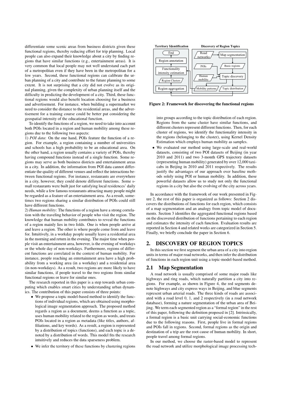 根据图2所示的我们的工作框架,本文的其余部分组织如下:第2节发现了每个区域的函数分布,包括地图分割和来自文档主题模型的类比。第3节基于发现的与每个区域相关的功能分布来识别聚集的功能区域,并估计每个功能的强度。第4节报告了评估结果,第5节对相关工程进行了分类。最后,我们在第6节对论文进行了简要的总结。
