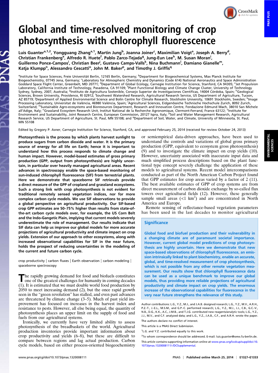 全球粮食和生物燃料生产及其在气候变化中的脆弱性具有极其重要的社会意义。然而,目前的全球作物光合作用模型预测是高度不确定的。在这里,我们证明了新的基于太空的叶绿素荧光观测,一种与植物生物化学内在联系的发射,能够准确、全面和长时间分辨率的基础上测量作物光合作用,这是任何其他遥感植被测量都不可能做到的。结果表明,叶绿素荧光数据可以作为一个独特的基准来改进我们的全球模型,从而为农业生产力和气候对作物产量的影响提供更可靠的预测。在不久的将来,荧光观测能力的巨大增长增强了这项研究的相关性。