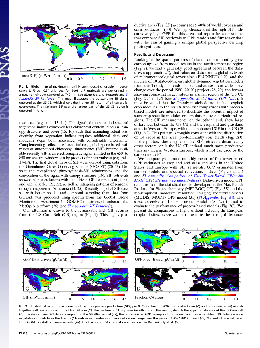 光合作用是植物吸收阳光,从二氧化碳和水中生产糖类的过程。它是地球上所有生命的主要能量来源。因此,了解这一过程如何应对气候变化和人类影响作出反应是很重要的。然而,基于模型的总初级生产力(GPP,光合作用的产出)估计是高度不确定的,特别是在人类影响很大的农业地区。光谱学的最新进展使天基监测来自陆生植物的太阳诱导叶绿素荧光(SIF)成为可能。在这里,我们证明了星载的SIF反演提供了对农田和草地生态系统的GPP的直接测量。对于传统的遥感植被指数和更复杂的碳循环模型来说,这种与作物光合作用的联系并不明显。我们利用SIF的观察结果提供了一个关于农业生产力的全球视角。例如在美国玉米带和印度-恒河平原,基于SIF的作物GPP估计比最新的碳循环模型的结果高出50-75%,这意味着当前的模型严重低估了管理的作用。我们的结果表明,SIF数据可以帮助我们改进我们的全球模型,以便更准确地预测农业生产率和气候对作物产量的影响。将我们的方法扩展到其他生态系统,以及在不久的将来增加对SIF的观测能力,有可能减少当前和未来碳循环建模中的不确定性。