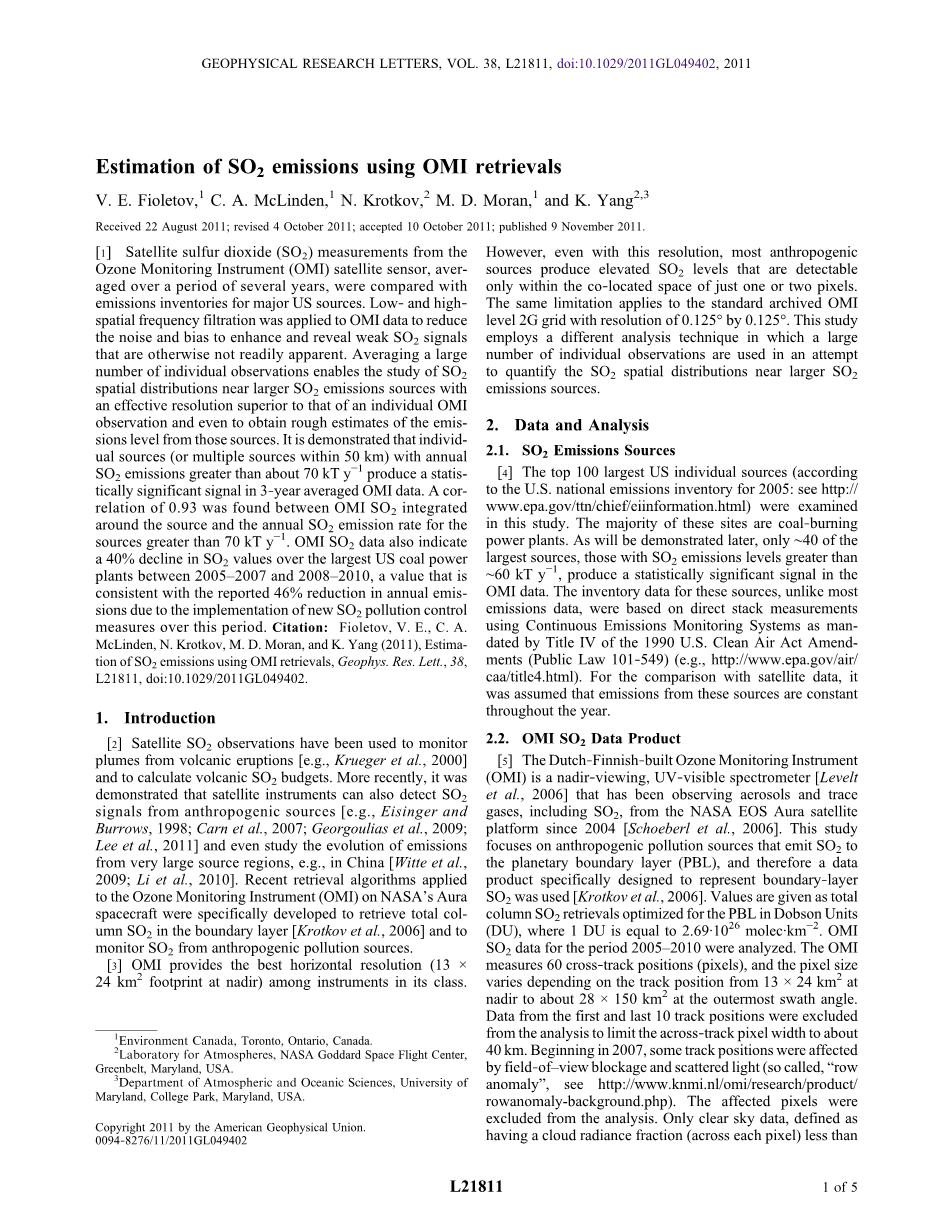 [11] 假设可比较的SO2源产生相似的长期平均OMI SO2值,OMI SO2可以与各个来源的排放水平相关,并进一步提供年度排放估算。为了量化源附近的SO2总量,在一个时间窗口和半径内,将一个2‐维高斯函数OMI SO2 = a·f(x, y)拟合到OMI SO2测量值,其中: