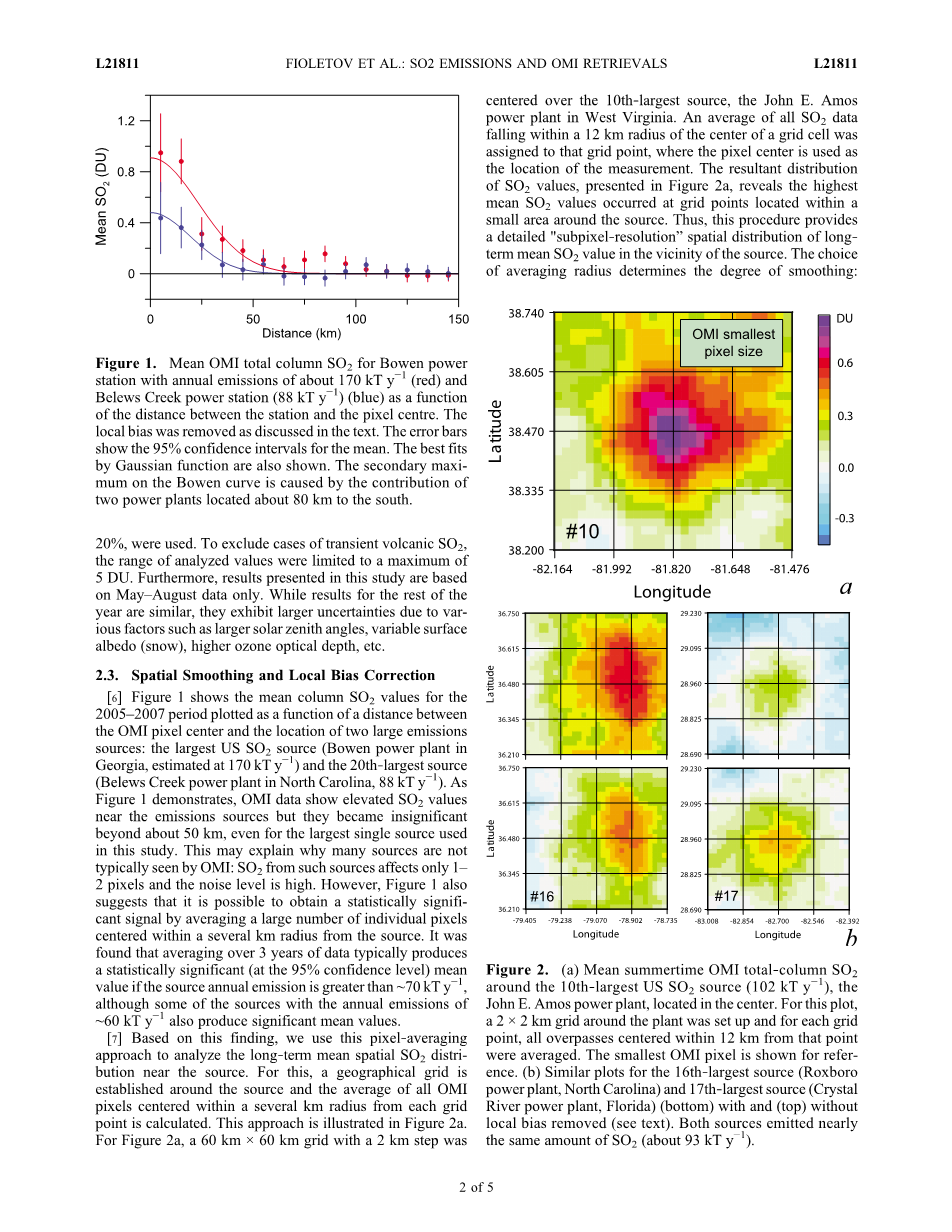[6]图一表示了2005-2007年间的平均值,这个值是根据像元中心距排放点的距离来计算的。排放点指的是美国较大的两个SO2排放源(位于格鲁吉亚的鲍文电厂,排放量约为170kTyminus;1)和第二十高的SO2排放源(位于北卡罗来纳州的Belews Creek电厂,排放量约为88kTyminus;1)。正如图1所示,OMI的数据显示,排放源附近的SO2值有所升高,但超过50公里之后,这些数值变得微不足道,即使是本研究中使用的最大的单一排放源也是如此。这也许可以解释为什么OMI通常看不到许多排放源:来自这些排放源的SO2只影响1 - 2像素,而且噪声水平很高。然而,图1还表明,可以通过对大量位于距源半径几公里范围内的单个像素进行平均来获得具有统计意义的信号。结果发现,如果源的年排放量大于sim;70kTyminus;1,则对3年的数据求平均值通常会产生统计上显著的平均值(在95%的置信水平上),尽管有些源的年排放量为sim;60kt yminus;1也会产生显著的平均值。