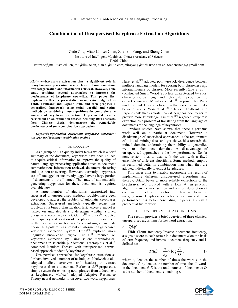关键字提取在许多语言处理任务中扮演着重要的角色,例如文本摘要,文本分类和信息检索。然而,在通过结合几种方法来提高关键短语提取性能这一方面,并没有人做过研究。本文首先实现了三种具有代表性的无监督算法TfIdf,TextRank以及ExpandRank,然后提出了一种使用串行,并行和表决方法的通用框架,将这些算法结合起来以对关键词提取进行全面分析。并且在包括1040篇中国论文摘要的评估数据集上进行的实验结果证明了某些组合方法的卓越性能。