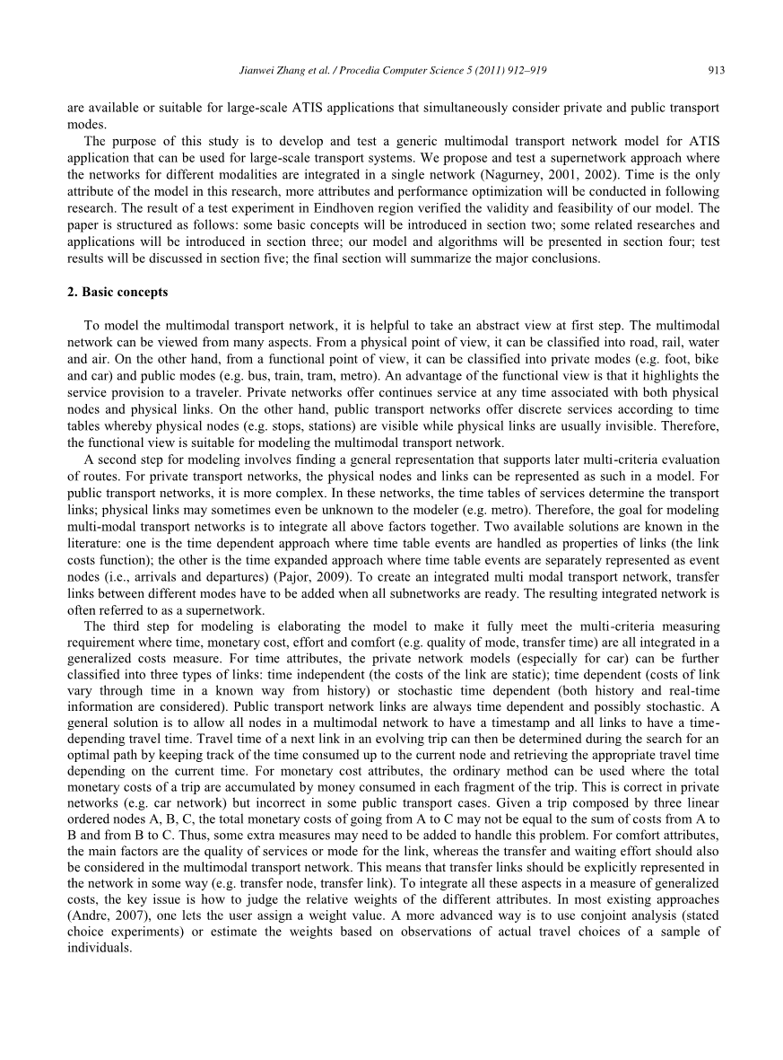 作为智能运输系统(ITS)不可或缺的重要一部分,高级旅行者信息系统(ATIS)将为旅行者提供出行前的行程状况信息以及在变化状况典型的一天下的动态运输网络中导航的实时建议。很多国家引进了Pamp;R设施,通过促进私人和公共交通工具之间的转换来缓解城市中心的拥堵问题。因此对涉及到私人和公共交通的多模旅行模型进行建模就显得尤为重要。·上述服务背后的基本问题是如何为ATIS建立正确的多模运输网络以及如何设计对应的算法来支持旅行者查询。据作者了解,还没有通用的多式联运网络模型(或无缝基础模型)和算法适用于大尺度下同时考虑到私人和公共交通模式的ATIS应用。本文的目的是开发和测试一种能够在大尺度的运输网络下的ATIS系统通用的多模联运网络模型。我们提出并测试了一种把不同模式的网络集成到一个简单网络中的超级网络方法(Nagurney,2001,2002)。时间是此研究中模型的唯一属性,在后续的研究中将进行更多属性和性能优化。在埃因霍温地区进行的测试实验结果证明了该模型的有效性和可信性。文章的结构如下:第二部分将介绍一下基本概念;第三部分将介绍一些相关的研究和应用;第四部分将介绍我们的模型和算法;第五部分会讨论我们的测试结果;最后一部分则是对主要结论进行总结。