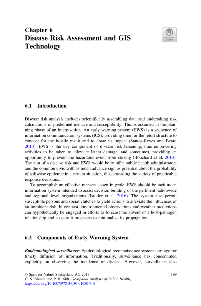 疾病风险分析包括科学地收集数据并对预先确定的威胁性和易感性进行风险计算。这是在假定阶段的所应做的事情。预警系统(EWS)是由一系列的信息通信系统(ICS)组成,为应对结策略供时间,以应对不利的结果并减弱其影响(Santos-Reyes和Beard 2013)。EWS是降低疾病风险的关键组成部分,因此,因该采取行动来减轻潜在的危害,有时EWS还能提供了一个机会用于预防危险事件的发生(Bouchard et al. 2013)。疾病风险和EWS的目标是为公共卫生管理人员和普通公民提供尽可能多的关于在特定情况下发生疾病流行的可能性的预警信号,从而做出各种可行的应对决策。