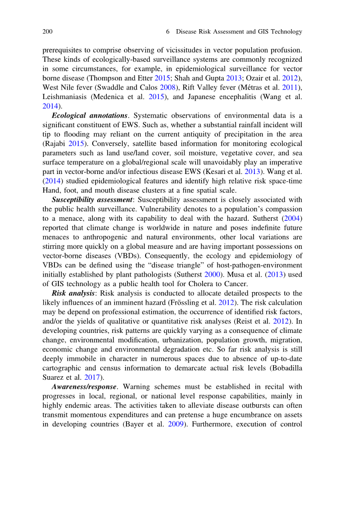 易感性评估:易感性评估与公共卫生监测密切相关。脆弱性指的是一个民族对危险的警惕心,以及它应对危险的能力。Sutherst(2004)报告说,气候变化是全球性的,对人类活动和自然环境造成了不确定的未来威胁,其他局部变化在全球范围内迅速蔓延,并对病媒传播疾病(VBDs)产生了重要影响。因此,VBDs的生态学和流行病学可以使用最初由植物病理学家建立的宿主-病原体-环境“疾病三角”来定义(Sutherst 2000)。Musa等人(2013)将GIS技术作为公共卫生工具用于从霍乱到癌症。