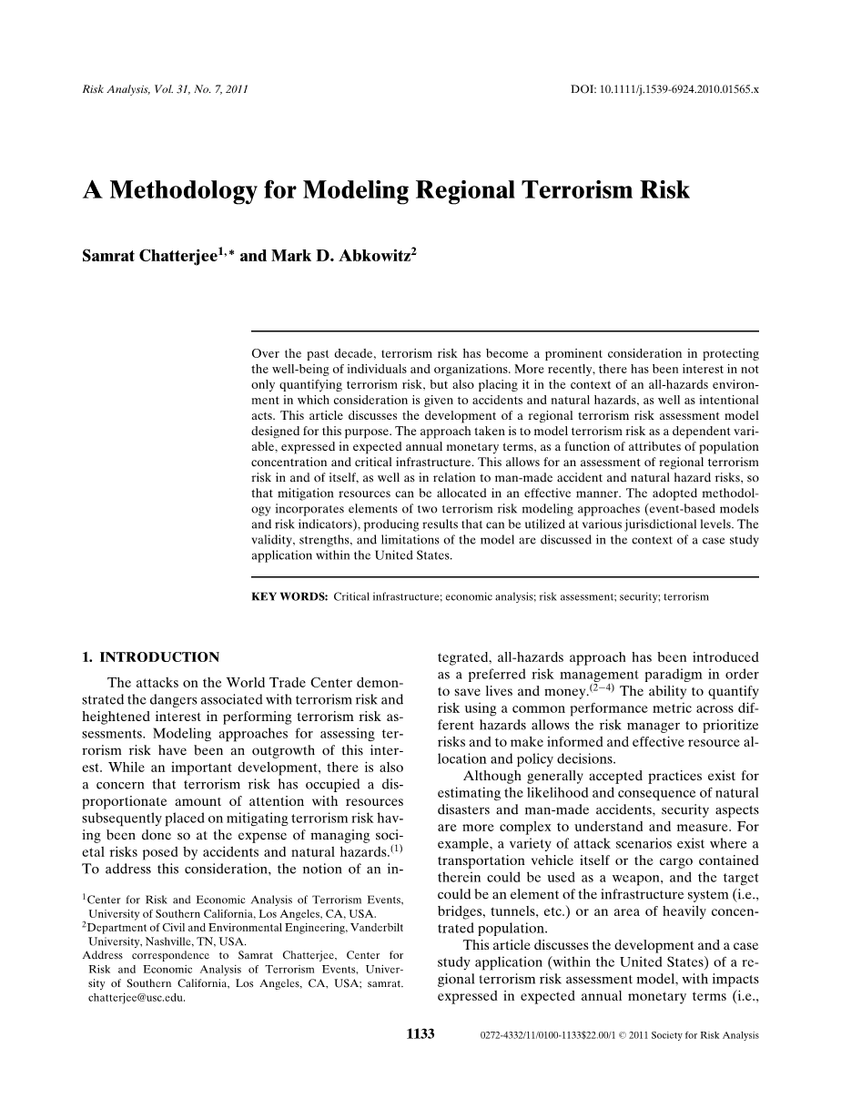 本文论述了开发和案例研究应用程序(在美国)地区恐怖主义风险评估模型,与预期的年度货币形式对影响(即风险成本),可以使用为基础的比较恐怖主义风险在不同的地区,以及与人为事故和自然灾害风险。所采用的方法结合了两种恐怖主义风险建模方法(基于事件的模型和风险指标)的元素,产生的结果可以在不同的司法级别使用。