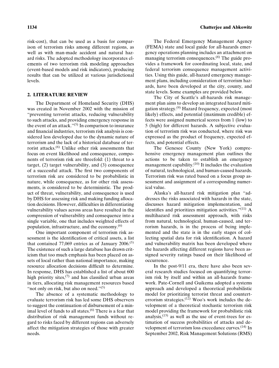 世贸中心遭受的恐怖袭击凸显了与恐怖主义风险相关的危险,并提高了人们将恐怖主义风险视为本质的兴趣。评估恐怖主义风险的建模方法一直是这种兴趣的延伸。虽然这是一项重要的进展,但也有人担心,恐怖主义风险已经占据了过多的注意力,随后将资源放在减轻恐怖主义风险上,而牺牲了对事故和自然灾害造成的社会风险的管理。为了解决这一问题,为了拯救生命和金钱,人们引入了“事前全险”的概念作为首选的风险管理模式。在不同风险之间使用公共性能度量来量化风险的能力允许风险管理人员优先考虑各种风险,并做出明智和有效的资源定位和政策决策。