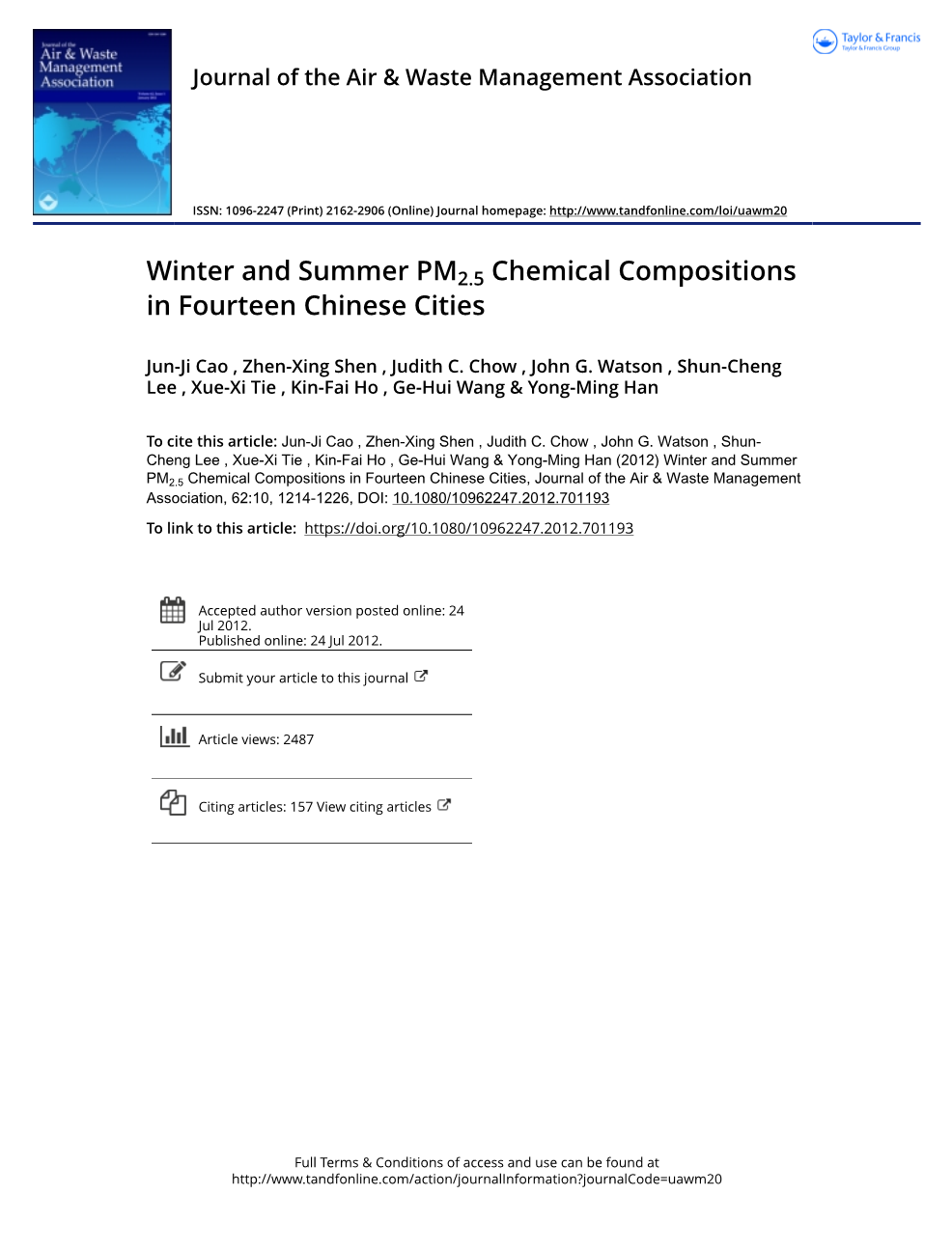 李成,铁雪曦,何建辉,王戈辉,韩永明(2012)我国14个城市冬季和夏季PM2.5化学成分,空气与废弃物管理协会学报,62:10,1214-1226,DOI: 10.1080/10962247.2012.701193