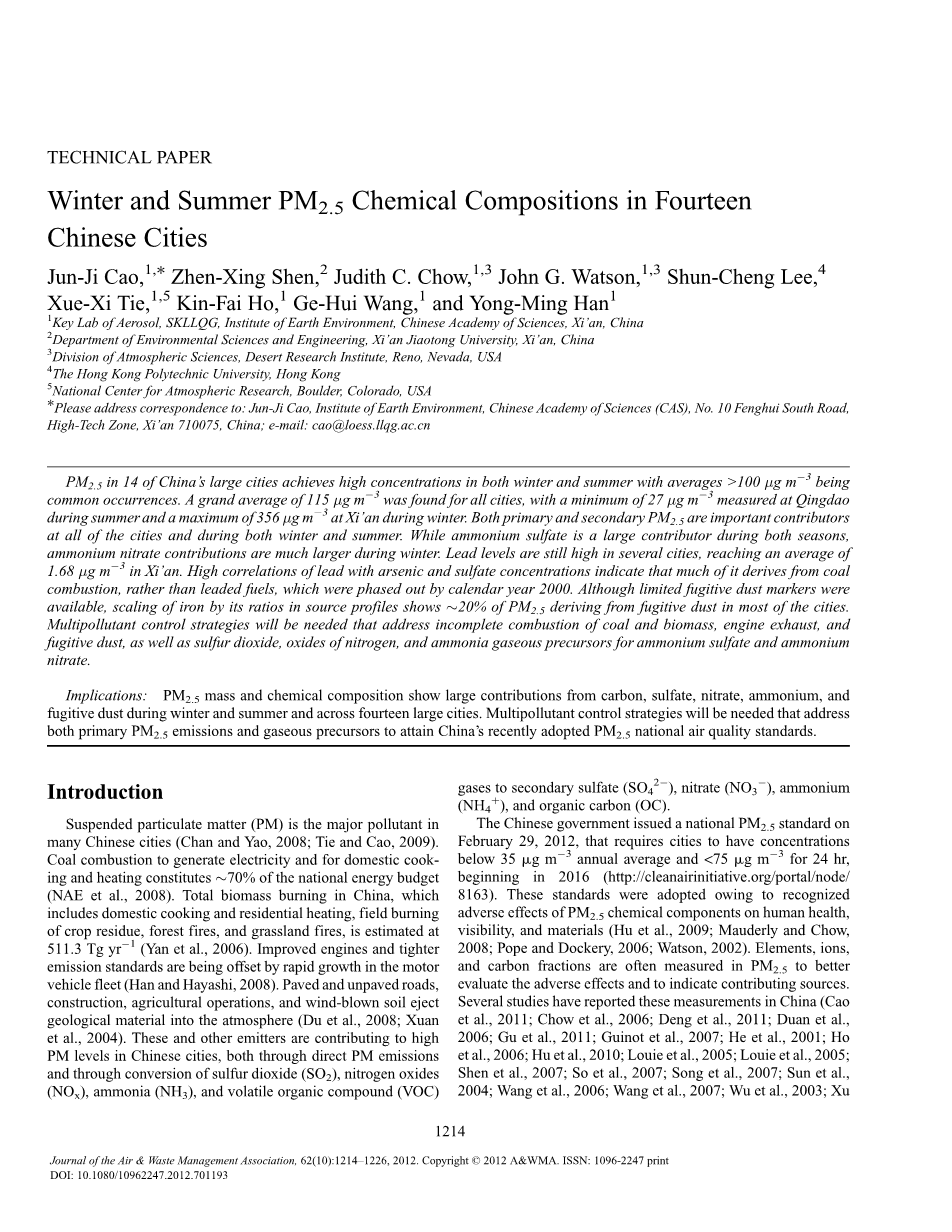 我国14个大城市PM2.5在冬季和夏季均达到较高浓度,平均浓度为gt;100 g m3。所有城市的总平均值为115克m3,其中夏季青岛最低测量值为27克m3,冬季西安最大测量值为356克m3。无论是在冬季还是夏季,一级和二级PM2.5都是所有城市的重要因素。虽然硫酸铵在两个季节都有较大的贡献,但硝酸铵在冬季的贡献要大得多。几个城市的铅水平仍然很高,西安的平均水平为1.68立方米。铅与砷和硫酸盐浓度的高度相关性表明,铅主要来自煤炭燃烧,而不是含铅燃料,后者已于2000年逐步淘汰。虽然有有限的扬尘标记物可用,但根据其来源剖面的比例,铁的比例显示,PM2.5的20%来自大多数城市的扬尘。需要采取多种污染物控制战略,解决煤和生物质的不完全燃烧、发动机尾气、扬尘以及二氧化硫、氮氧化物和硫酸铵和硝酸铵的氨气体前体。
