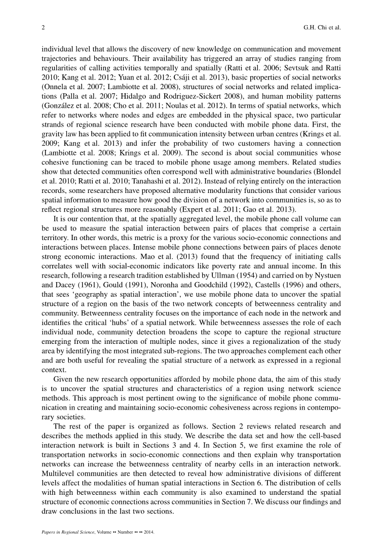 本文的其余部分组织如下。第二节对相关研究进行了回顾,并介绍了本研究所采用的方法。我们将在第3节和第4节中描述数据集以及如何构建基于单元格的交互网络。在第5节中,我们首先考察了交通网络在社会经济联系中的作用,然后解释了为什么交通网络可以增加互动网络中邻近细胞的中间性中心性。在第6节中,我们检测了多层次的社区,以揭示不同层次的行政区划如何影响人类空间互动的方式。在第7节中,我们还考察了各群落间高间接性细胞的分布,以了解各群落间经济联系的空间结构。我们将在最后两部分讨论我们的发现并得出结论。