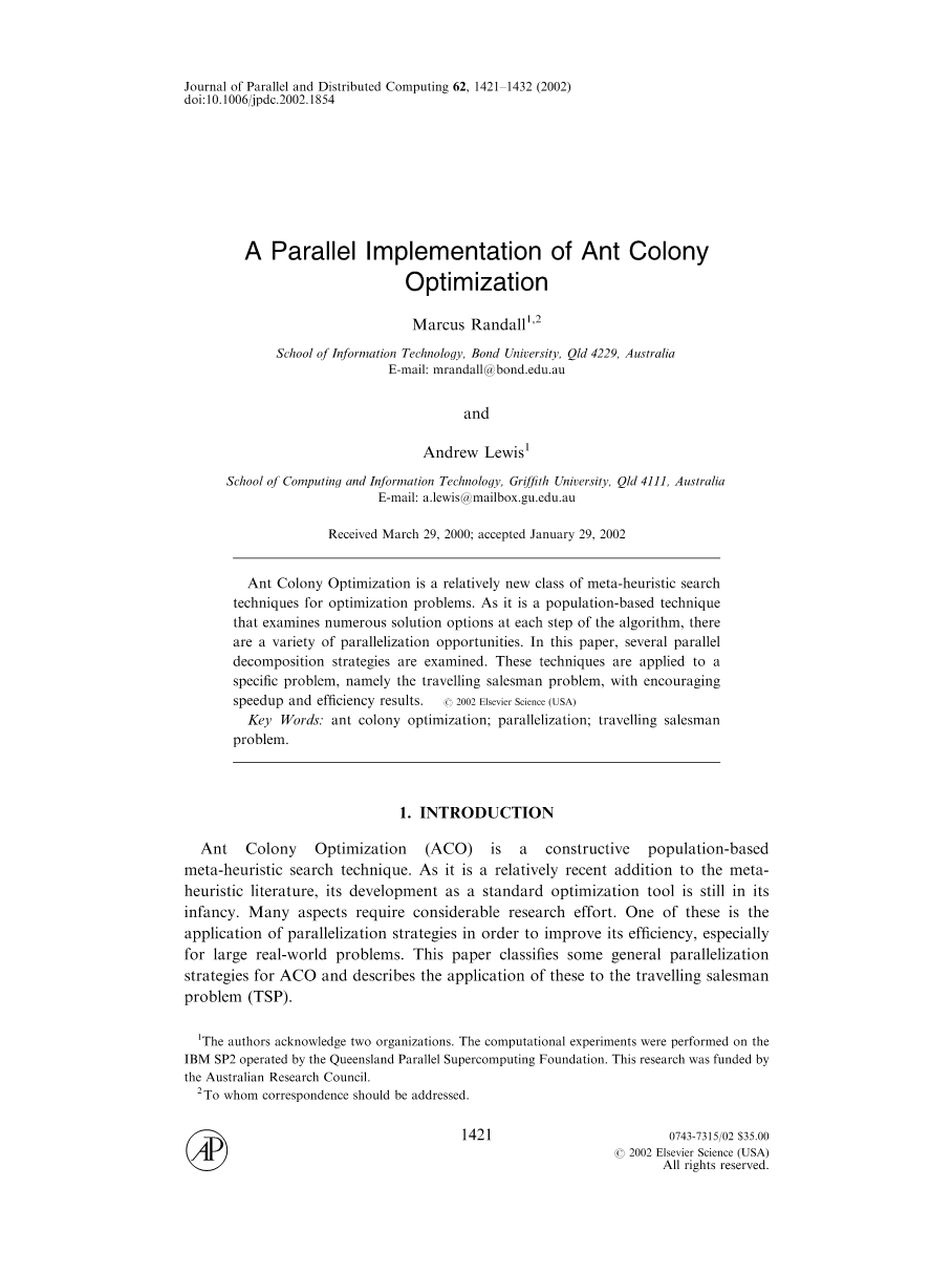 在本文中,TSP作为上述并行方案之一,即对并行蚂蚁方案经验进行评估,仅此方案试用,原因如下:并行蚁群相互通信的开销对TSP来说太大。然而,对于其他问题如网络综合问题(见[15])中,具有更小的信息素结构,这种技术会更合适。解决方案要素技术的并行评价(和以后蚂蚁并联算法和解决方案要素技术的评价的组合)是唯一有效的,如果一个元素的评价的成本高(即,计算是昂贵的或者有许多与难约束来评估),这就不适合的TSP的情况。再次,网络综合问题将受益于这种方法。