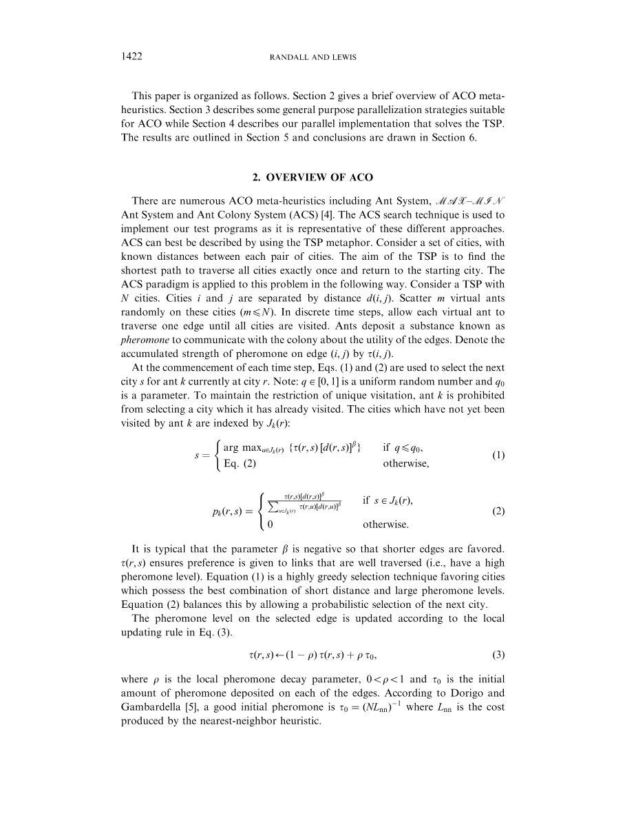本文安排如下:第2节给出ACO元启发式的简要概述。第3节描述了适用于ACO的一些通用的并行策略,而第4节介绍解决TSP问题的并行策略实现。结果列于第5节中,结论在第6节总结。