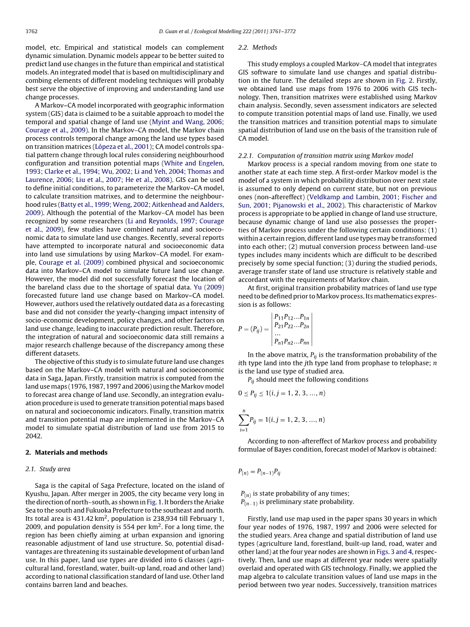 本文的研究目标为基于CA-Markov模型和自然、社会经济数据,预测日本saga市未来的土地利用变化情况。首先,应用1976,1987,1997和2006的土地利用图计算转换矩阵,利用markov模型预测土地利用的面积变化。其次,一个集成评价程序用于生成过渡潜在的地图基于自然和社会经济指标。最后,将转换矩阵和转换潜力图,执行CA-Markov模型预测未来2015-2042年的土地利用空间分布。