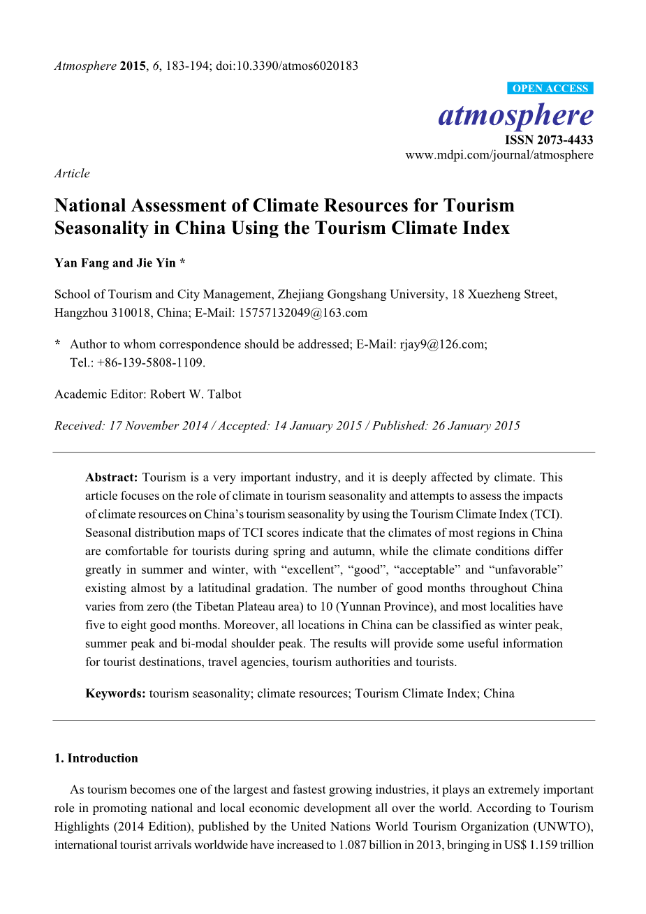 摘要:旅游业是一个非常重要的产业,受气候影响很大。本文重点关注气候在旅游业季节性变化中的作用并且尝试利用旅游气候指数(TCI)研究气候资源对中国旅游业的季节性影响。