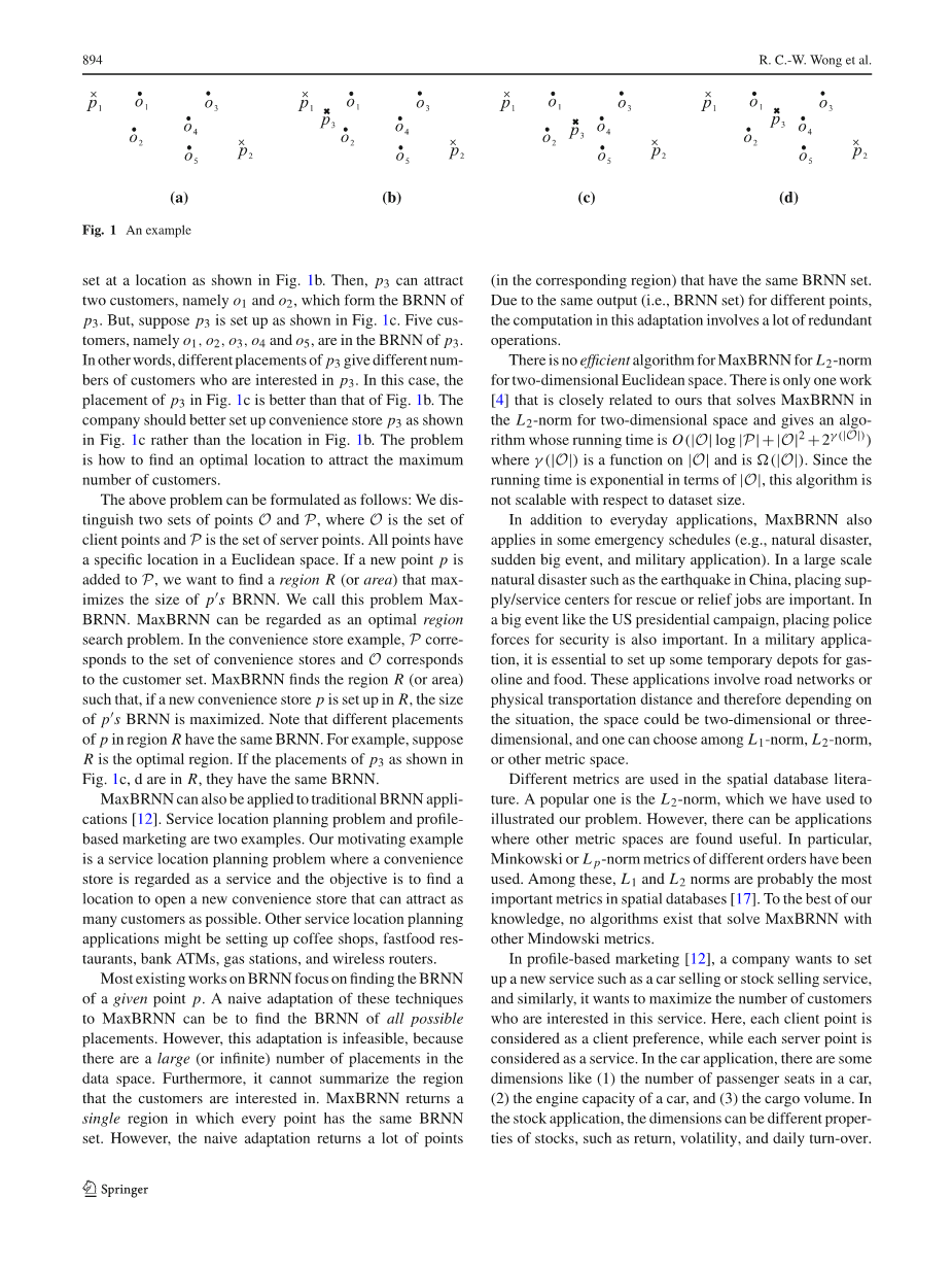 接下来,考虑建立一个新的便利店p3,并且该公司试图找到一个位置来最大限度地提高将要去那里的顾客数量。假设p3设置在如图1b所示的位置。 然后,p3可以吸引两个客户,即o1和o2,它们构成p3的BRNN。 但是,假设p3的设置如图1c所示。 五个客户,即o1,o2,o3,o4和o5,在p3的BRNN中。 换句话说,p3的不同位置给了对p3感兴趣的客户的不同数量。 在这种情况下,图1c中p3的放置比图1b好。 公司应该更好地设置便利店p3,如图1c所示,而不是图1b中的位置。 问题是如何找到一个最佳位置来吸引最多的顾客.