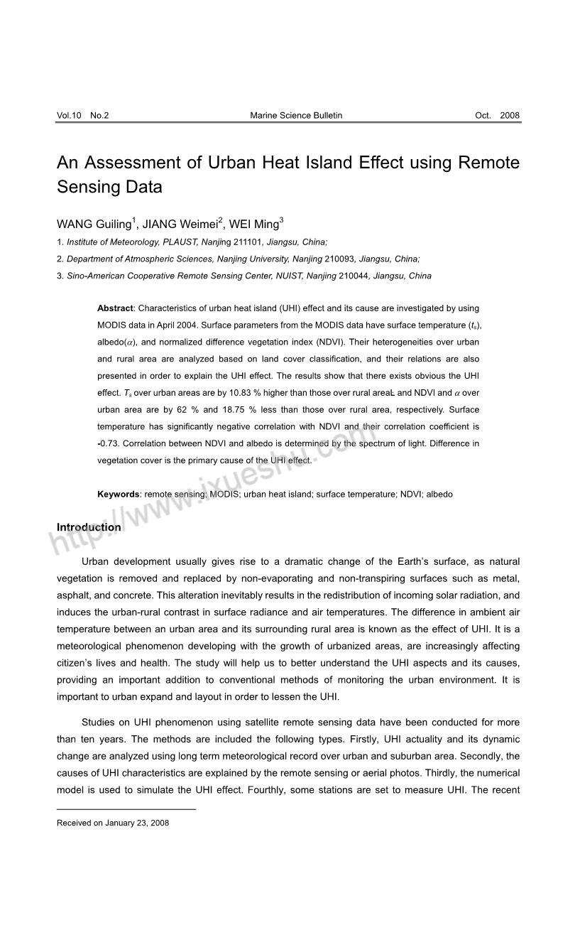 摘 要:利用 MODIS 资料研究了 2004 年 4 月南京城市热岛特征及其影响因子,结合地表覆盖类型分析了植被 归一化指数(Normalized Difference Vegetation Index,NDVI)、地表温度(Ts)、地表反照率( alpha; )的城乡差异及其相 互关系,探讨了城市热岛(Urban Heat Island,UHI)效应形成的机制。结果表明:南京城区存在着明显的城市热 岛效应;城市平均 Ts 比乡村高约10.83 %;城市 NDVI 和 alpha; 分别比乡村低约为62 %和18.75 %;NDVI 与 Ts 呈 负相关,相关系数为-0.73,而 NDVI 与 alpha; 之间关系与波段有关;城乡植被覆盖差异是造成 UHI 的主要原因, 其次是地表反照率,通过提高植被覆盖率和地表反照率可以减小城市热岛效应。