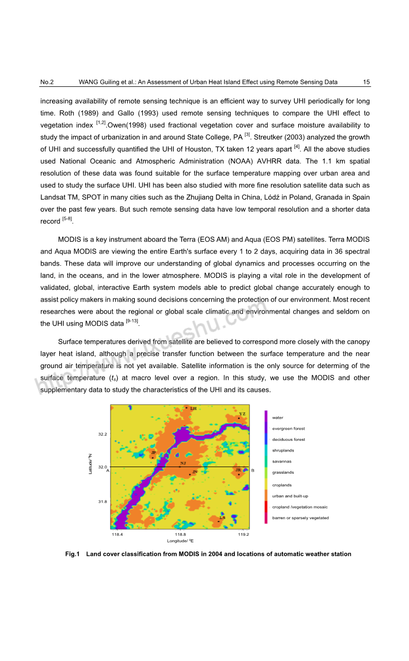 从卫星得到的表面温度被认为与冠层热岛更紧密地联系在一起,虽然表面温度与近地面气温之间的精确传递函数还没有出现。卫星信息是在一个区域的宏观水平上决定地表温度的唯一来源。在本研究中,我们使用MODIS和其他辅助数据来研究UHI的特征及其原因。
