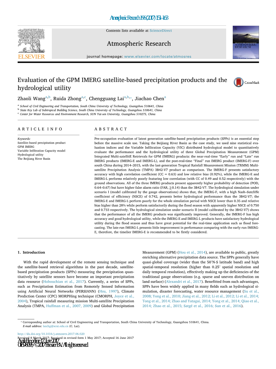 关键词:卫星降水产品,GPM-IMERG,变入渗透能力模型,水文效用,北江流域