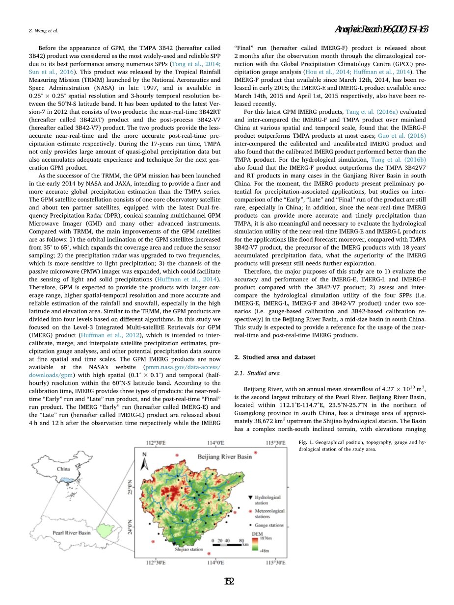 在GPM出现之前,TMPA 3B4200(以下简称3B42)产品因其在众多SPP中性能最好而被认为是应用最广泛、最可靠的SPPs(Tong et al.,2014;Sun等人,2016)。该产品是由美国国家航空航天局(NASA)于1997年底发射的热带降雨测量任务(TRMM),在50°N-S纬度带之间,具有0.25°times;0.25°的空间分辨率和3小时的时间分辨率。它已于2012年更新为最新版本7,由两个产品组成:近实时3B42RT(以下简称3B42RT)产品和后处理3B42-V7(以下简称3B42-V7)产品。这两种产品分别提供了不太准确的近实时和更准确的后实时预测。在17年的运行期间,TMPA不仅提供了大量全球降水数据,而且为下一代GPM产品积累了足够的经验和技术。