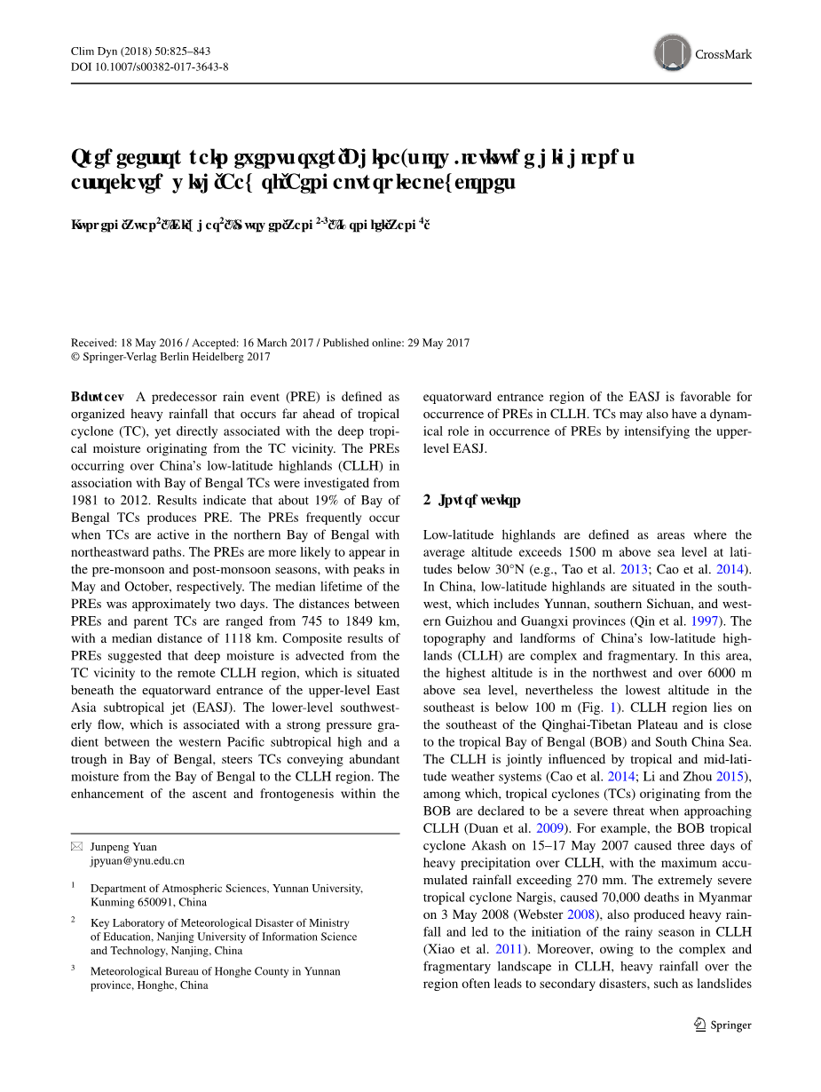 大量研究还表明,BOB-TCs可能在TC登陆前在CLLH产生远距离强降雨。卫星云图显示,宽广的纬向云带从BOB TC附近延伸到CLLH的强降雨区。BOB-TCs可能为CLLH地区提供丰富的暖湿空气,并在该地区造成远距离强降水。TC的这种远距效应与TC或TC残余物产生的直接降水不同。