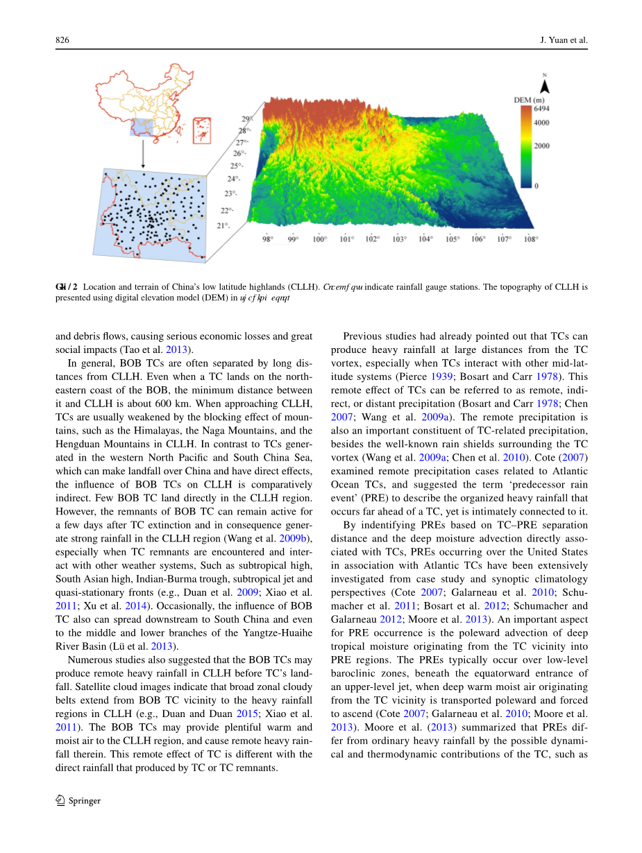 一般来说,BOB TCs通常与CLLH相隔很远。即使TC在BOB的东北海岸登陆,它和CLLH之间的最小距离也在600公里左右。当接近CLLH时,TCs通常受到山脉的阻挡作用而减弱,如CLLH中的喜马拉雅山、纳嘎山和横断山。与北太平洋西部和南海产生的TCs登陆中国并产生直接影响相比,BOB-TCs对CLLH的影响相对间接。很少有BOB TCs直接在CLLH地区登陆。然而,在热带气旋消失后,BOB热带气旋的残余低压可以保持活跃几天,从而在CLLH地区产生强降雨,特别是当热带气旋残涡遇到并与其他天气系统相互作用时,如副热带高压、南亚高压、印缅槽,副热带急流和准静止锋。偶尔,BOB TCs的影响也会向下游扩散到华南地区,甚至到江淮流域的中下游支流。