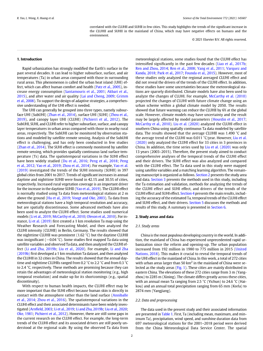 关于对人类健康的影响,CLUHI效应可能比SUHI效应更重要,因为人类皮肤直接接触大气而不是陆地表面(Anniballe等人,2014;周等人,2016)。CLUHI效应及其相关决定因素的时空变化已被广泛研究(Arnfield,2003;Li等人,2019;Li和Cha,2019b;Liu等人,2020;Oke,1981;Pichierri等人,2012)。然而,目前对CLUHI效应的研究还存在一些空白。例如,在区域范围内,对CLUHI效应及其相关驱动因素的长期趋势仍然知之甚少。通过使用气象站观测到的气温数据,一些研究发现,在过去几十年中,CLUHI效应显著增强(Liao等人,2007b;Ren和Zhou,2014;Ren等人,2008;Yang等人,2011;Varquez和Kanda,2018;Park等人,2017;Founda等人,2015)。然而,这些研究大多只分析了区域平均CLUHI效应,而没有揭示CLUHI效应趋势的驱动因素。此外,由于气象站分布稀疏,这些研究具有一定的不确定性。气候模式也被用来分析CLUHI的变化。例如,McCarthy等人利用全球气候模型中的城市方案,到2050年预测了CLUHI随着未来气候变化的变化。结果表明,未来气候变暖可使全球CLUHII减少6%。然而,气候模型可能具有不确定性,结果可能在很大程度上受到模型参数的影响(Hourdin等人,2017;McCarthy等人,2010)。Liu等人(Liu等人,2020)利用卫星模拟的空间连续的气温数据分析了中国南方的CLUHI效应。结果表明,平均CLUHII为1.490 ℃,平均趋势为0.011 ℃/年。然而,Liu等人只对中国3个省的33个城市进行了CLUHI效应分析。此外,Liu等人使用的时间序列只有13年(2003-2015年)。因此,本研究旨在对CLUHI效应的时间趋势及其驱动因素进行综合分析,并对SUHI效应进行了分析,并与CLUHI效应进行了比较。这项研究中使用的气温数据是使用卫星变量和匹配学习算法绘制的。剩下的手稿组织如下。第二节介绍了研究区域和数据。第三节介绍了本研究使用的方法,包括气温的估计和验证,CLUHI效应和SUHI效应趋势的分析方法,CLURHI效应和SUHI效应趋势的驱动因素。第四节给出了主要结果,包括估算气温的准确性,CLUHI效应和SUHI效应的时间趋势,以及它们的驱动因素。第五节讨论了本研究的方法和结果。第6节给出了一个总结。