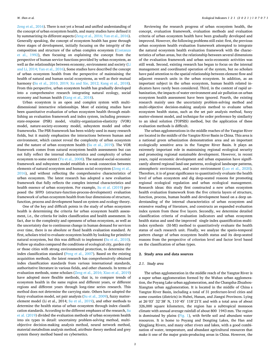长江中游城市群位于中国长江流域中部。该区是国家绿色城市化示范区和长江流域重要的生态敏感区。它对维护区域生态安全、促进区域可持续发展具有极其重要的作用。然而,近年来,快速的经济发展和城市扩张显著改变了区域土地利用格局、生态景观格局、大气环境和水环境(Luo等,2020)。因此,定量评价城市生态系统健康水平,挖掘深层次原因,对于促进区域生态调控和城市生态管理具有重要意义。研究思路:本研究首先在深入了解城市生态系统内在特征和广泛阅读文献的基础上,从结构、功能、过程、人类健康和发展五个标准层构建了新的城市生态系统健康评价框架,并从这五个层次构建了扩展的评价指标框架。其次,我们确定了评价指标和城市生态系统健康状况的详细分类标准,并采用改进的单指标量化-多指标综合法(SI-MI)对各研究单元的健康状况进行了定量评价。最后,在城市类型划分的基础上,从标准层面和因子层面,我们分析了城市生态系统健康状况的时空格局变化及其深层次原因。