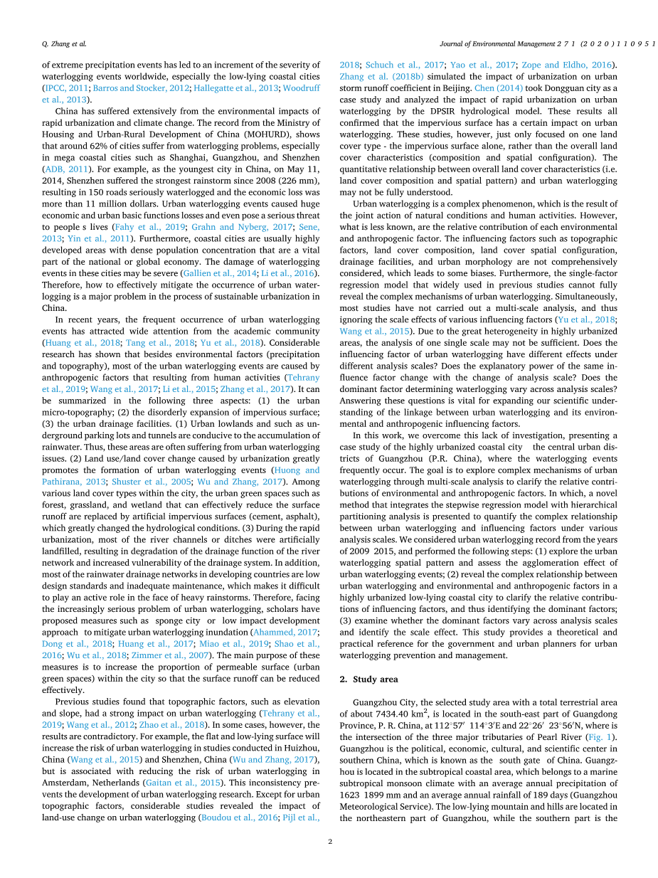 中国受到了快速城市化和气候变化带来的环境影响的广泛影响。中国住房和城乡建设部(MOHURD)的记录显示,大约62%的城市遭受内涝问题,特别是在上海、广州和深圳等沿海特大城市(亚行,2011年)。例如,作为中国最年轻的城市,2014年5月11日,深圳遭遇了自2008年以来最强的暴雨(226毫米),导致150条道路严重内涝,经济损失超过1100万美元。城市内涝事件造成巨大的经济和城市基本功能损失,甚至对人们的生活构成严重威胁(Fahy等人,2019年;Grahn和Nyberg,2017年;Sene,2013年;尹某等人,2011年)。此外,沿海城市通常是高度发达的地区,人口密集,是国家或全球经济的重要组成部分。这些城市的内涝事件可能会造成严重的破坏(Gallien等人,2014;Li等人,2016)。因此,如何有效缓解城市内涝的发生,是我国可持续城市化进程中面临的重大问题。
