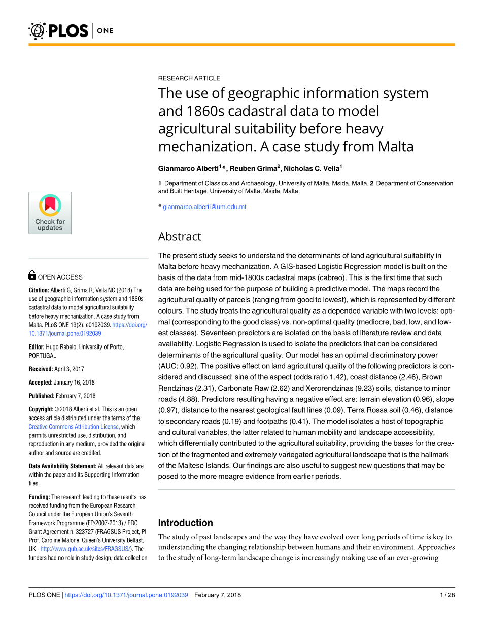 本研究的目的是探索马耳他高度机械化前农业用地适宜性的决定因素。基于gis的逻辑回归模型的建立是基于19世纪中期地籍图数据。这是第一次此类数据用于构建预测模型。地图记录了诸多地块的农业用地适宜性(从优良到最低),以不同颜色表示。本研究将农业质量作为一个依赖变量,分为最优(对应于好类)和非最优(一般、不适宜、差、极差)两个层次类)。在文献综述可用和数据有效的基础上,分离出17个预测因子。逻辑回归用于分离可以考虑的农业用地适宜性评价决定因素的预测因子。我们的模型具有最优的分辨能力(AUC: 0.92)。此外还考虑并讨论了各因子对农业用地质量的正向影响:各因子的比值比为1.42,海岸距离(2.46),棕色石灰土(2.31),碳酸盐原土(2.62)和干石灰土(9.23),到小路的距(4.88)。产生负影响的预测因子有:地形高程(0.96)、坡度(0.97)、到最近地质断裂带的距离(0.09)、红土(0.46)、到次要道路的距离(0.19)和人行道(0.41)。该模型分离出许多地形文化变量,后者与人类活动和景观可达性有关,而这些对农业用地适宜性有不同的贡献,为马耳他群岛创造破碎的和极度多样化的农业景观提供了基础。我们的研究结果也有助于提出可能对早期较为微薄的证据提出新问题。